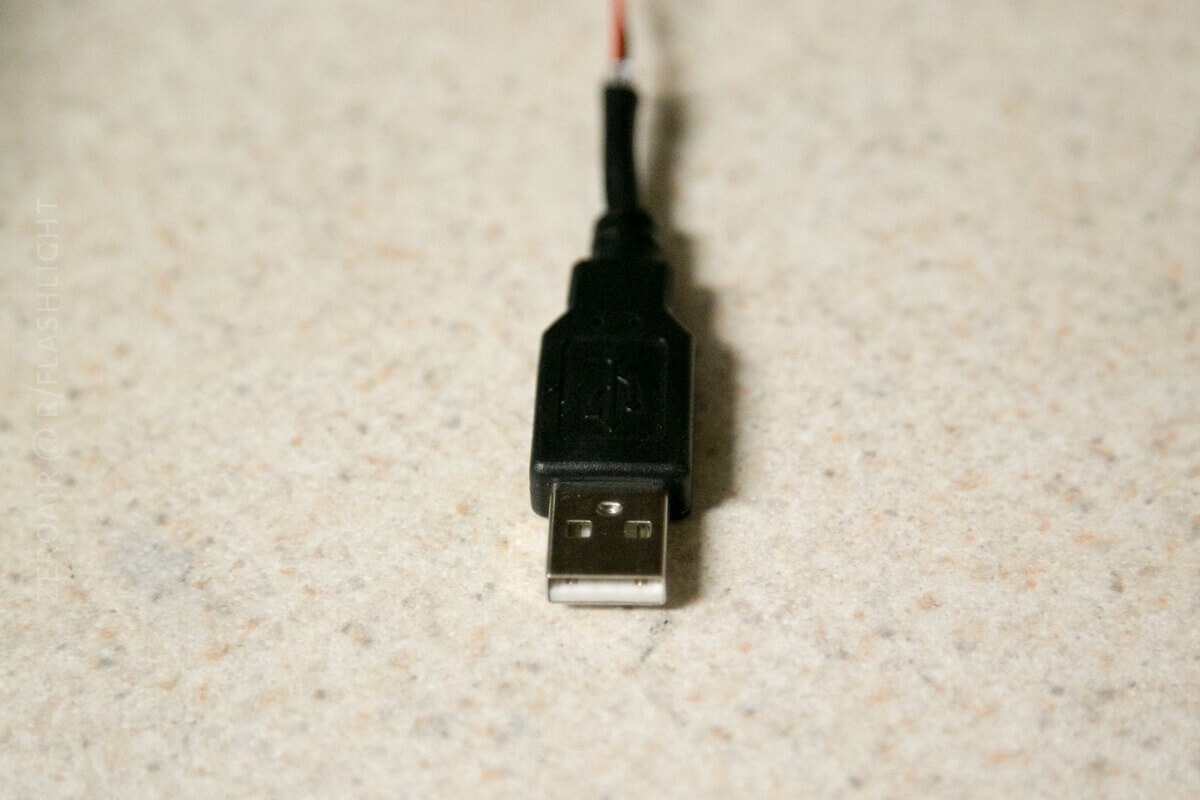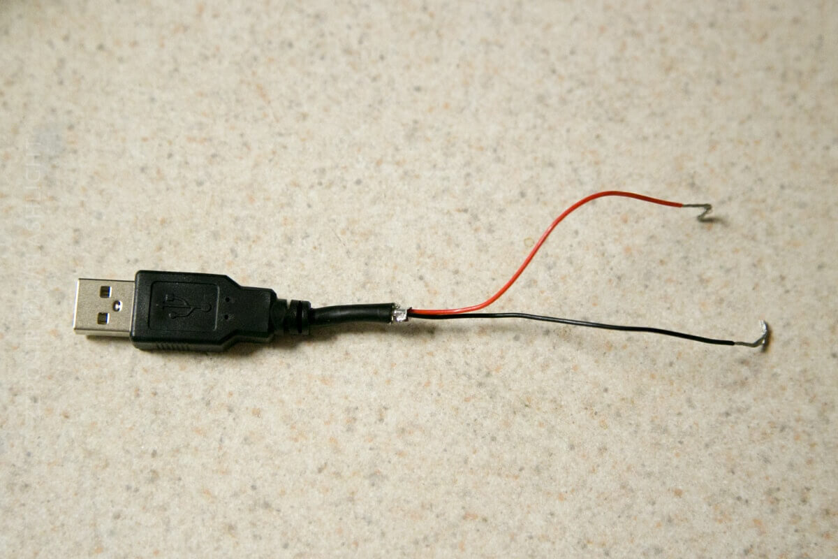 But you’ll need to murder it. Here I’ve lopped it off, stripped the wires, and kept only the power wires, red and black. The green and white aren’t important to us, because they’re connected to the data pins. As you can see, I’ve stripped the terminals to bare wire.