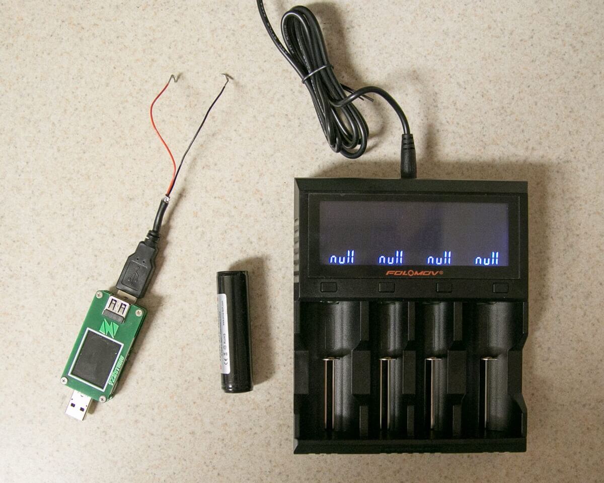 You’ll need to have the charger that you plan to test. Here I’m testing the charge rate of the Folomov A4. That is, I’m testing at what rate the cell voltage increases (not actually testing the rate that current is being put into the cell, though I believe it’s possible with this setup).