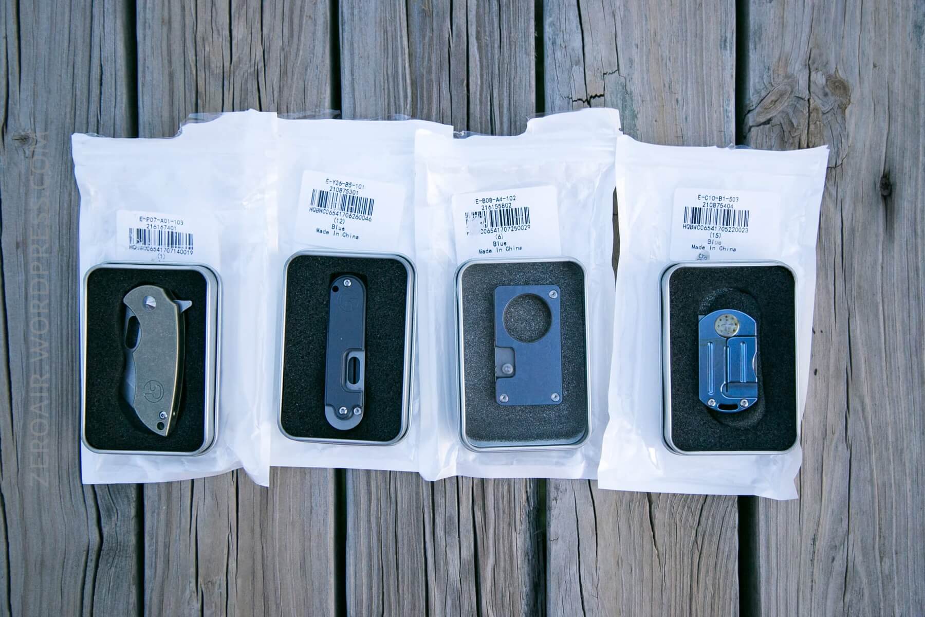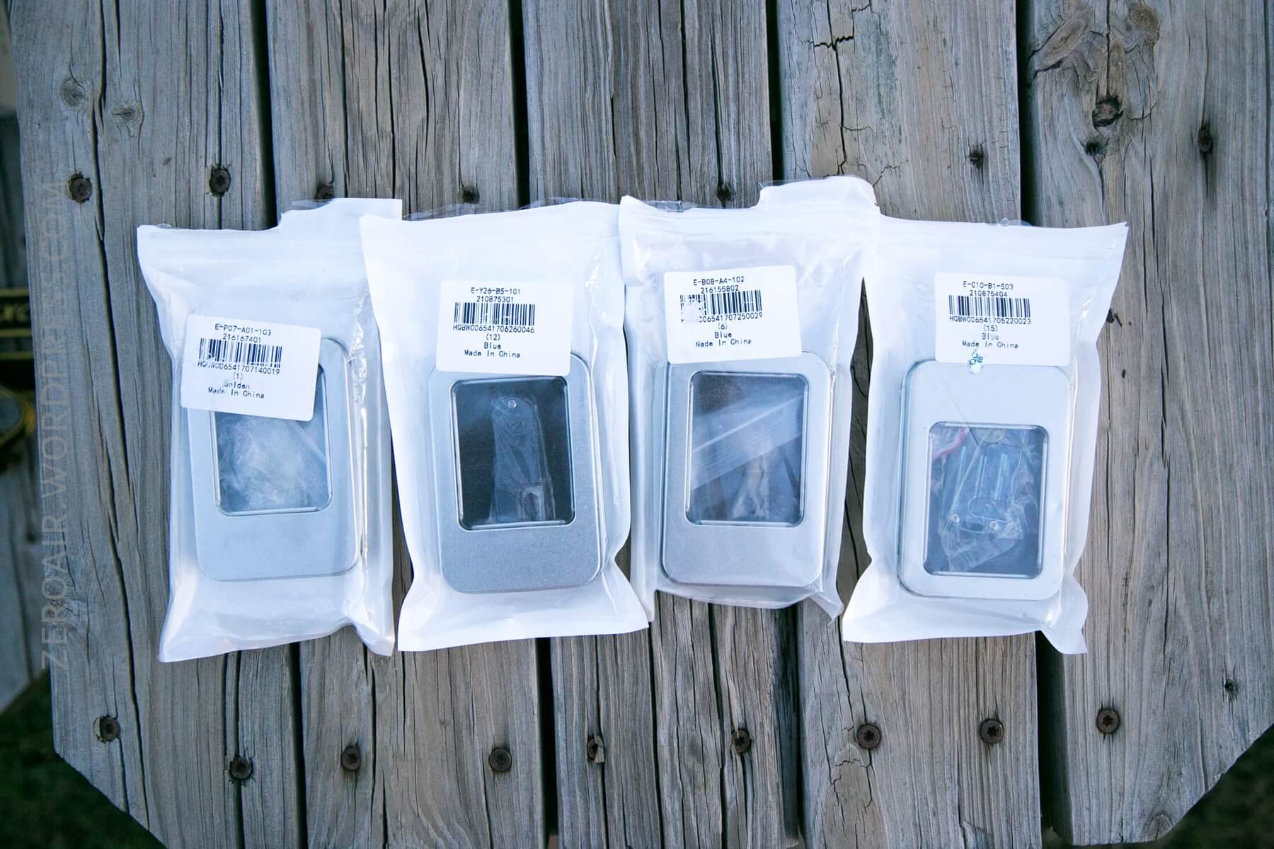 All four of these knives are in basically the same packaging. Each is in a plastic zip-top baggie, in a tin which has a window, and all of that is in a plastic bag with a clear front.