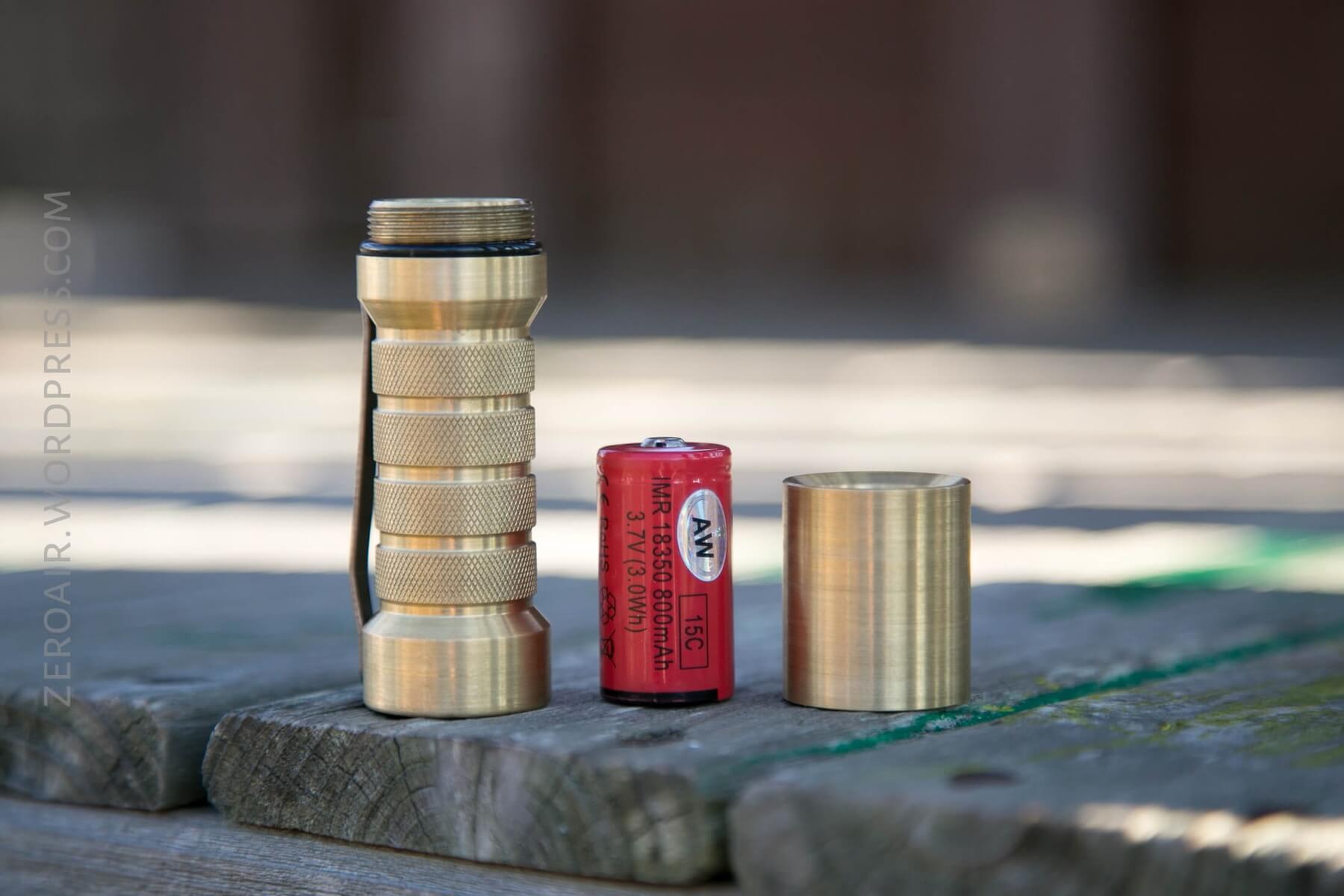 Here is the light broken down into its main parts. Just a body, and a head! Included with my light was this AW 18350, and Jeff said that including a cell is going to be standard practice now.