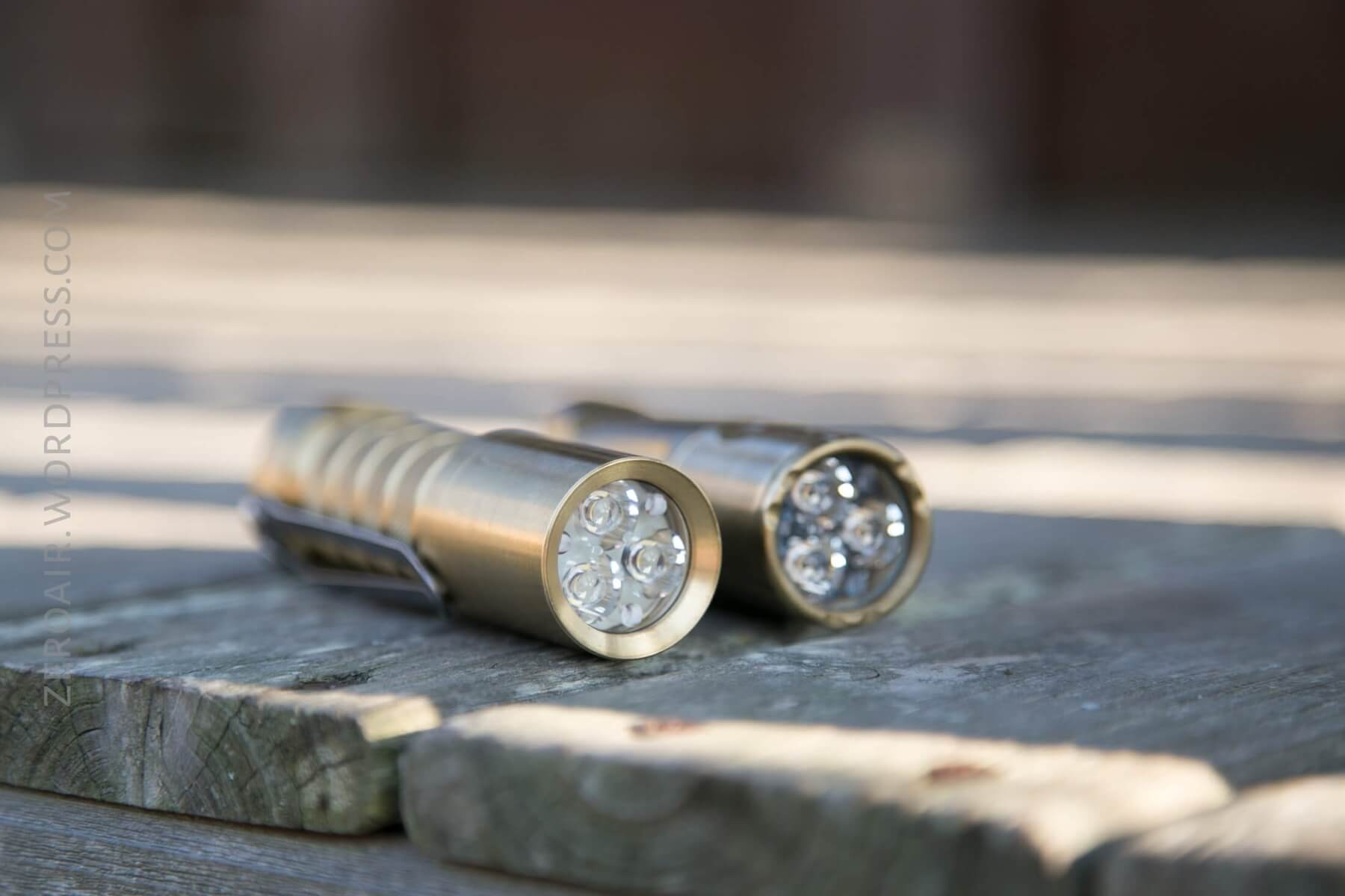 The Okluma DC1 Brass flashlight is on the right in the image below.