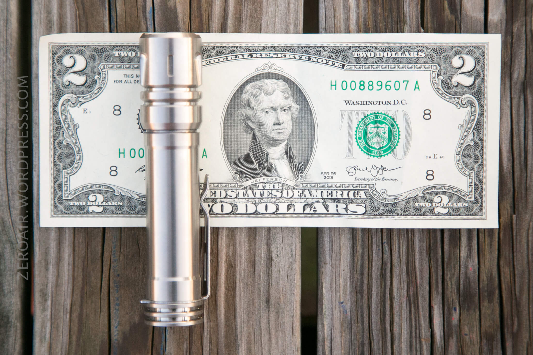 I measure this light at 95.9mm long and 21.1mm at the head. This is an AA-sized light. It’s great in hand, and rides almost invisibly clipped in a pocket.