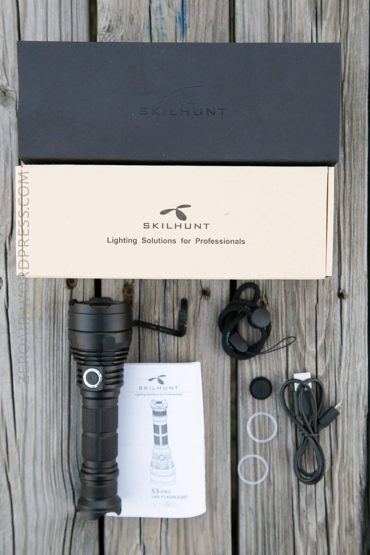 The package is better than I remember from Skilhunt. There’s a black sleeve around a cardboard box. This box has a sticker describing the light specifics, but not much more.