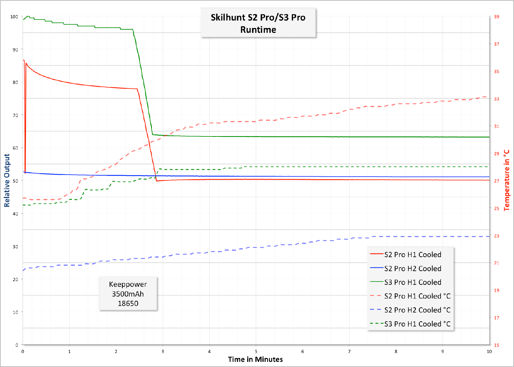 The output for the S3 Pro is higher, as we’d expect (it is an XHP35 after all). And the lights have the same stepdown (timed), at a respectable 2.5 minutes (see below). Further proof that these lights have almost the same [everything].