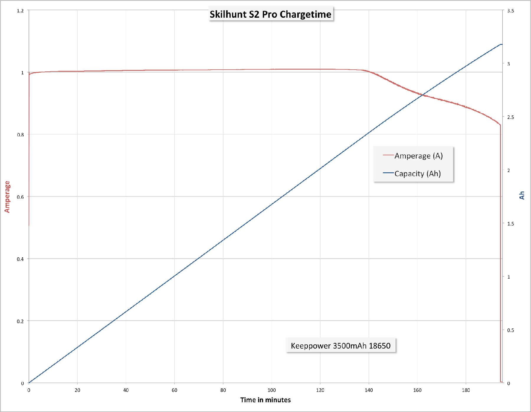 I can’t recall testing a Skilhunt with onboard charging, so I didn’t really know what to expect. As it turns out, these lights have excellent charge rates, staying just above 1A until the CV phase.