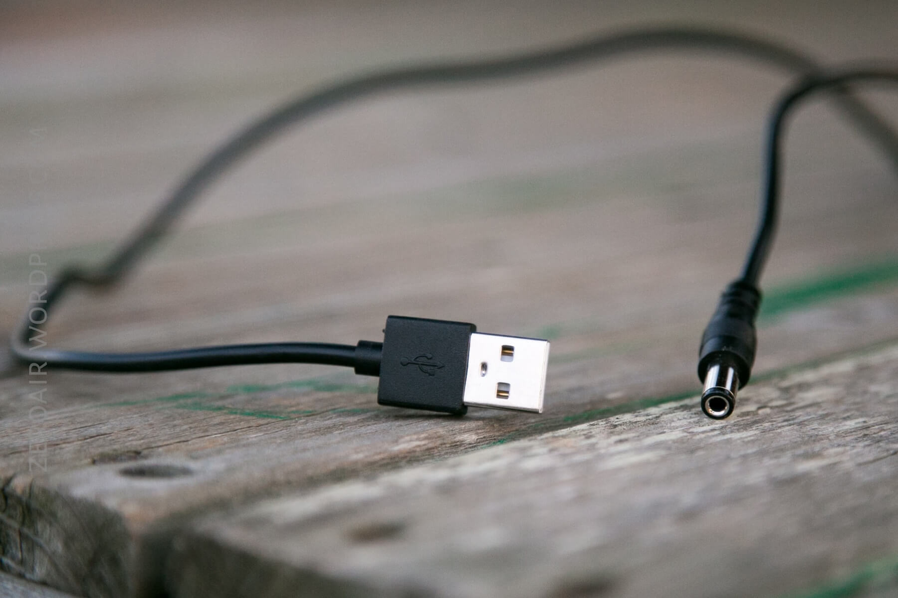 Here’s the provided cable. USB on one end, barrel plug on the other.