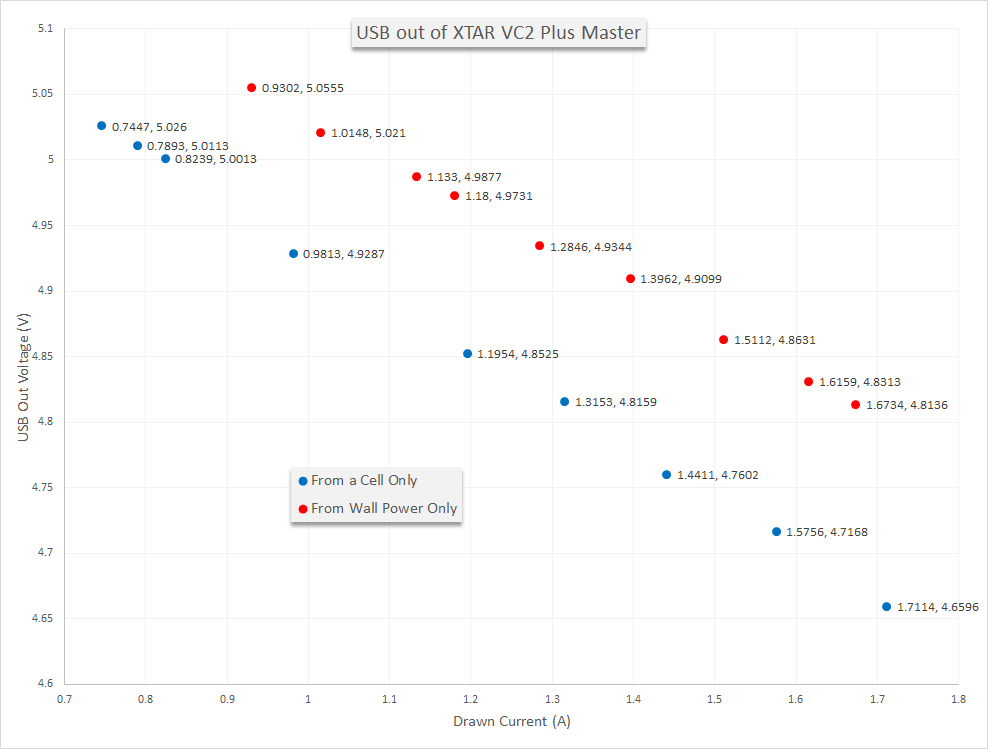 I tested the USB Out a little. See the graph below – these data points aren’t connected, and really, there are just two important points. That is when the unit stops providing power (right side of the graph). At around 1.6-1.7A, the USB shuts off completely. It’s still providing well within-spec voltage. This is true on wall power (with no cell in any bay) and off the bay that provides USB power (with no wall connection).