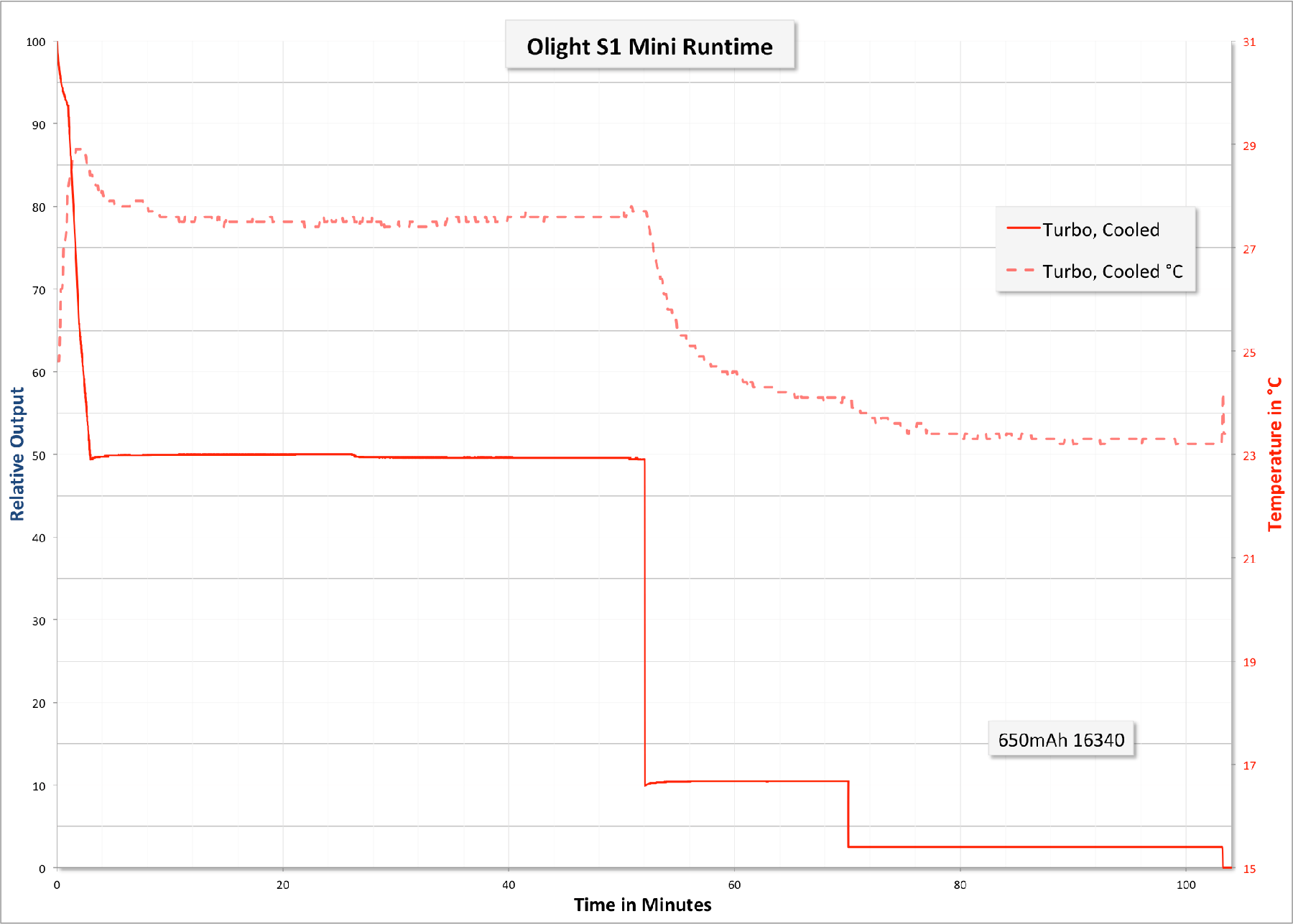 Runtime on Turbo is as follows. Stepdown is quick and heavy, all the way down to 50% output. Temperatures stay fairly low, however.