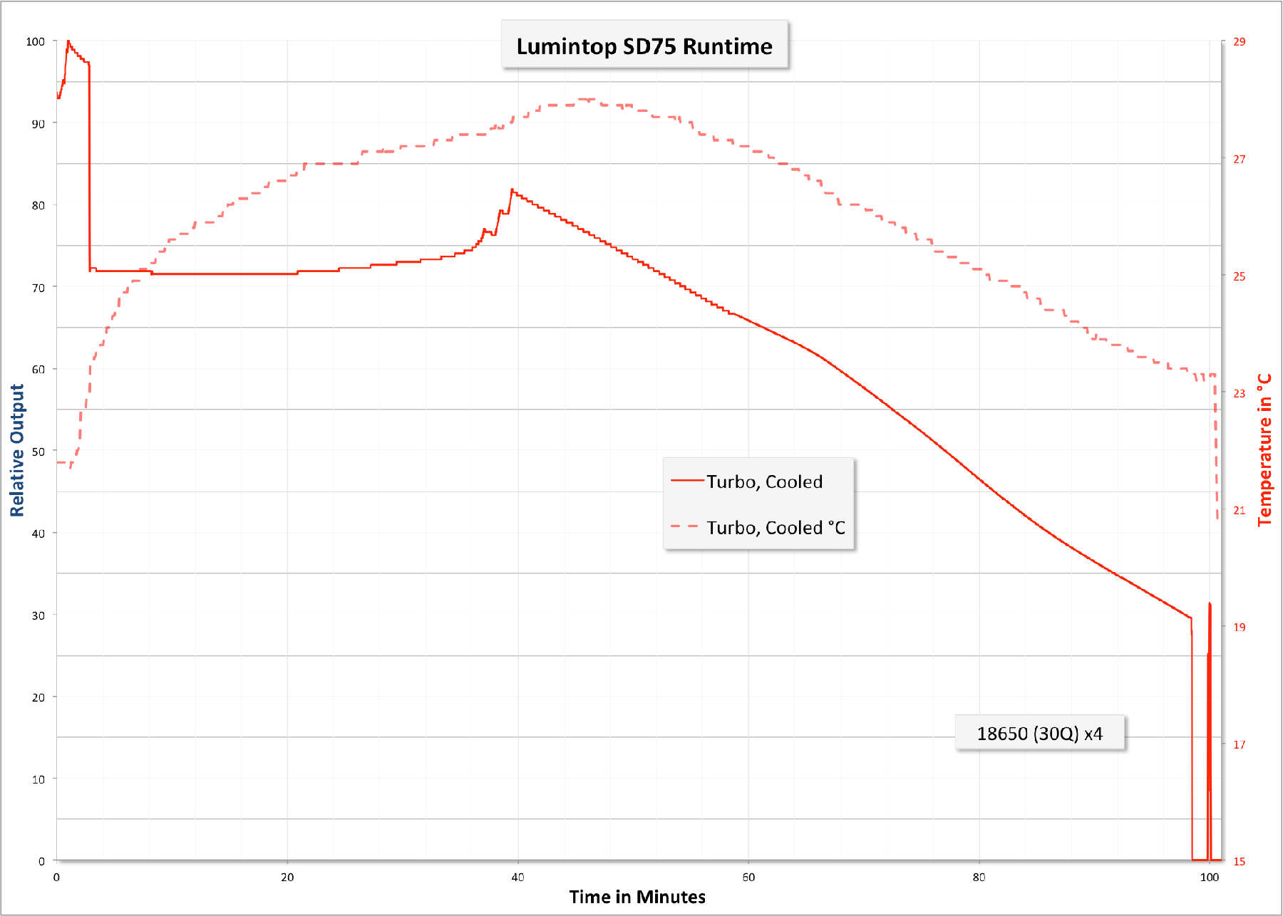 Here’s the runtime of the SD75 with the above cells. I stopped the test around 100 minutes to test the cell voltage – at that time they were around 3.15V. I didn’t want to run any risks of over-discharging the 30q’s, so I went ahead and stopped the test there. The cell holder was still reading around 6.3V at this point, and when I did turn the light back on (as seen in the graph), the output was low, and higher modes couldn’t be selected.