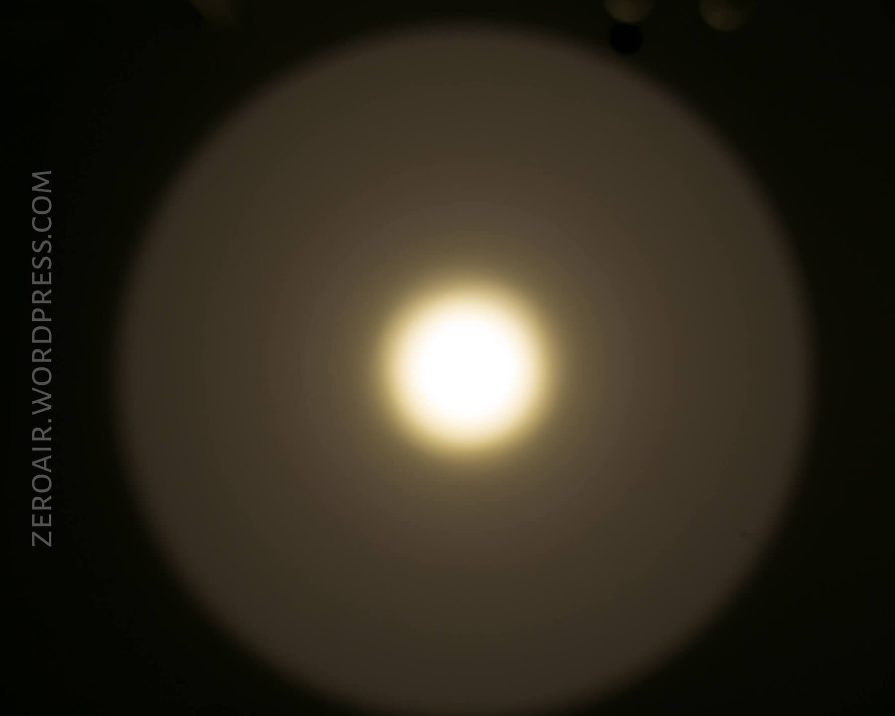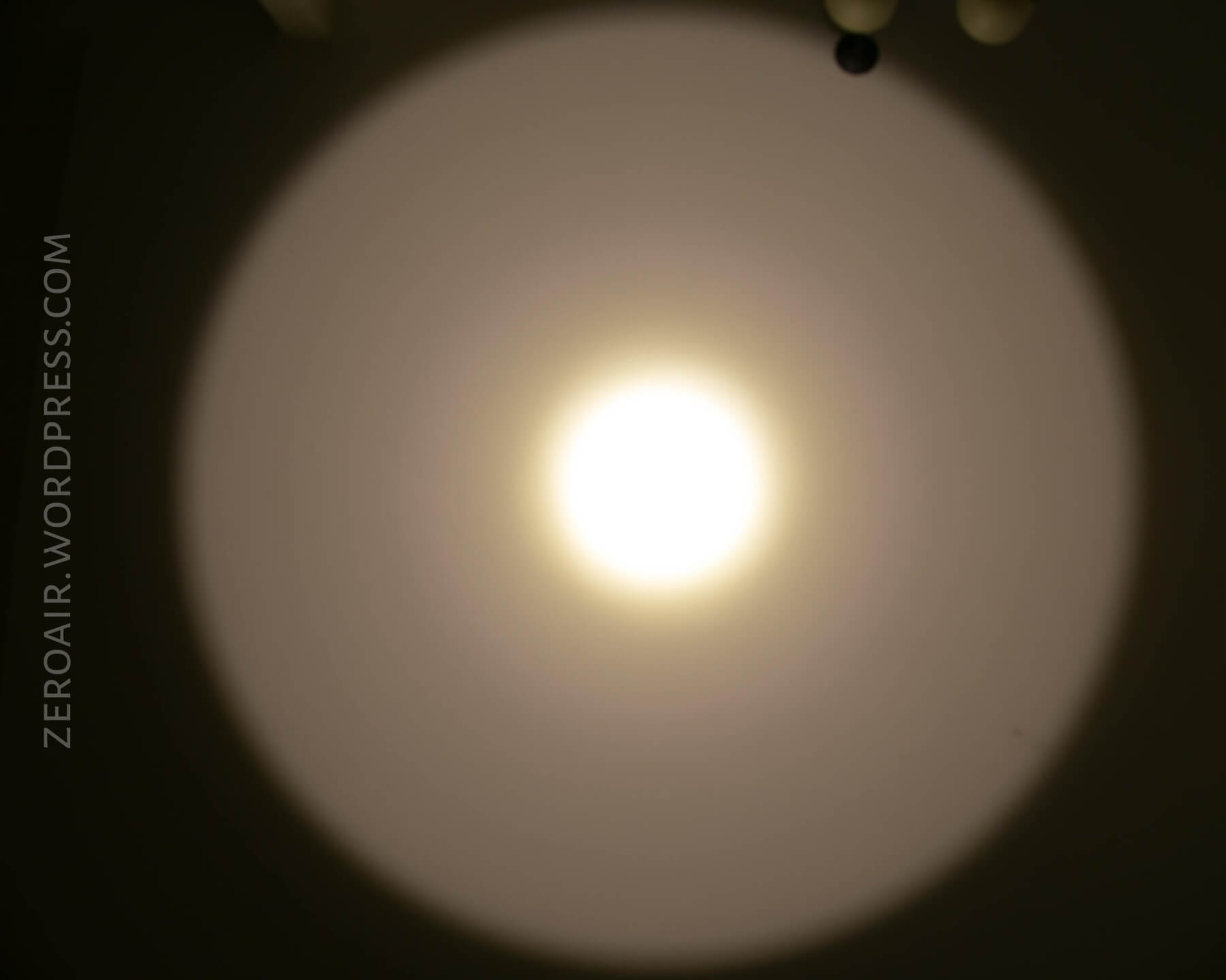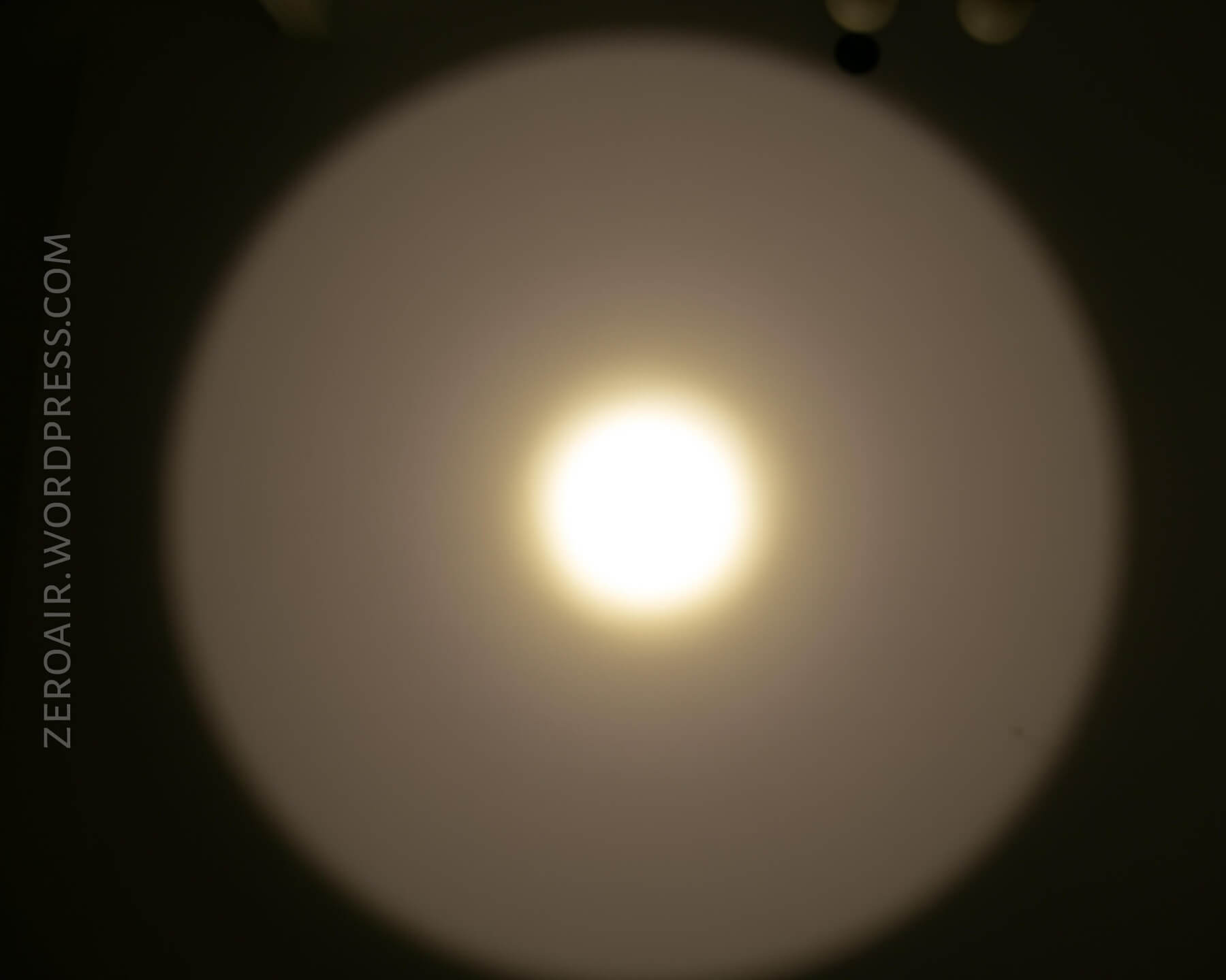 The beam is very much throw. The emitter sits under a very smooth, big reflector. The beam is – unlike the D1 – very concentrated on the focus point. (Just to contrast, the D1 has a defined hotspot, but it’s perfectly even all the way across the hotspot.)