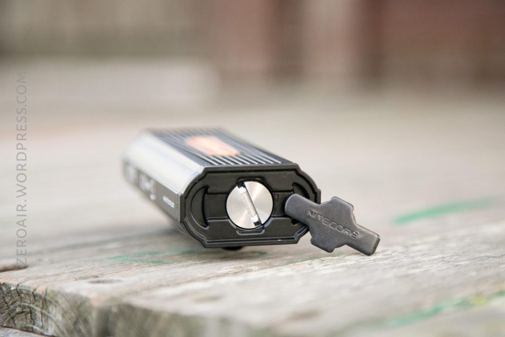 The battery has a screw-down closure. Fortunately, Nitecore includes an appropriate tool for opening this, and it stays handy by fitting in its location and staying there magnetically. That said, a coin could be used in this very wide slot. This closure is not hard to operate, but it’s fairly specific. Do it right or the cover will be askew.