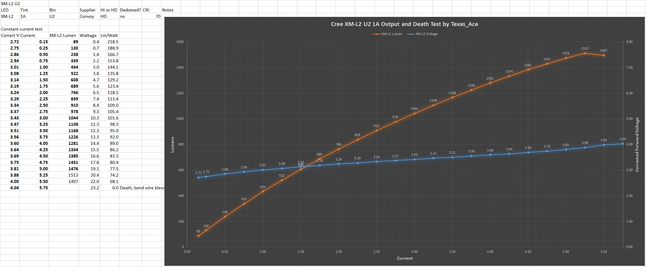 ^ Measurement disclaimer: Testing flashlights is my hobby. I use hobbyist-level equipment for testing, including some I made myself. Try not to get buried in the details of manufacturer specifications versus measurements recorded here; A certain amount of difference (say, 10 or 15%) is perfectly reasonable.
