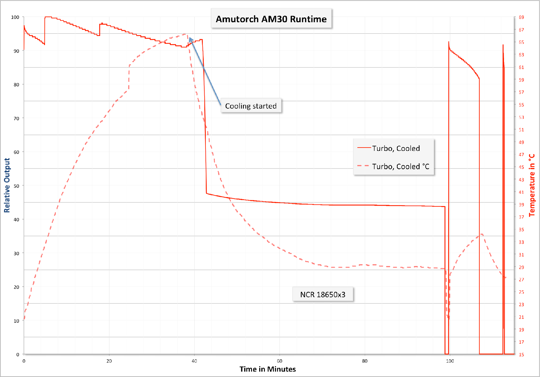 Strangely, soon after I turned on cooling, the light stepped down to around 45% and stayed there for a while. Until I pulled the cells for a voltage check, in fact. After a voltage check, I put the light back on turbo, where it stayed for a few minutes, then shut off, due to voltage protection. The listing says this will happen at 2.8V, but I found it to be much higher (around 3.3V). At this point, the indicating side switch was blinking red.
