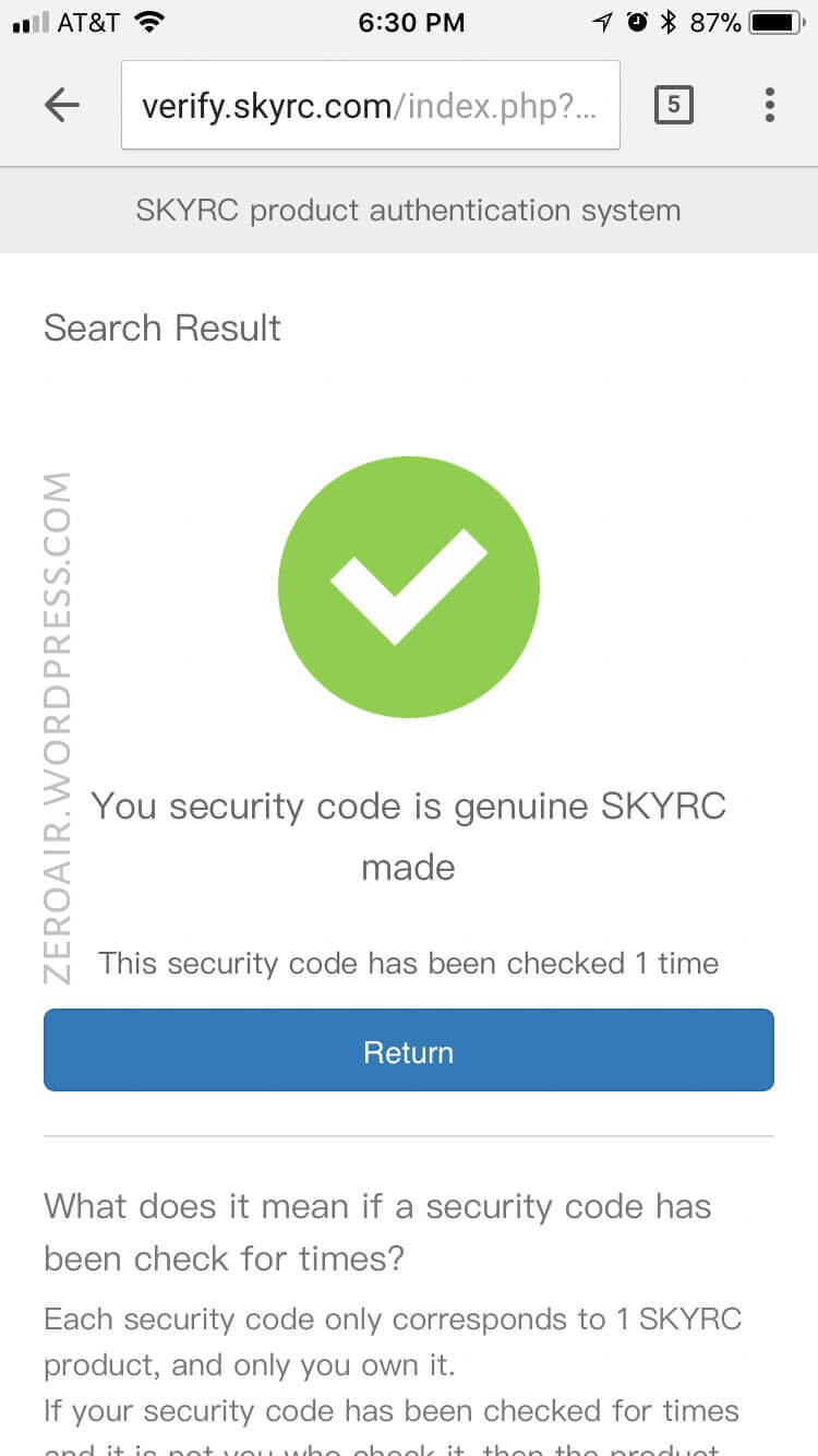 One final point about this unit, from GearBest. There are certainly fakes of the SkyRC products on the market. There are even units being sold from a single store, “Genuine” right beside “Copy” units (fully disclosed, at least). I can confirm that the unit I received from GearBest is a genuine SkyRC product. There’s a QR code label on the back of the unit itself (not the box), which can be scanned and will take a user to this page, below. This is the SkyRC verification page (confirmed to be the same page reached from SkyRC’s page). So, just an added bit of trust that this unit is the real deal.
