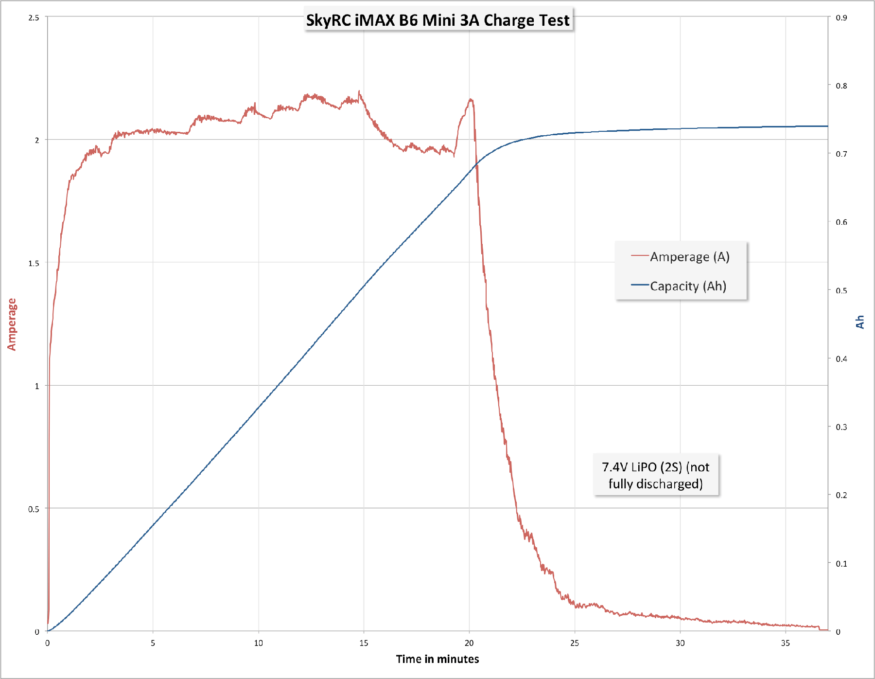 When I first started this review, I didn’t think I had a good (logging) means to test this charger. Well, after this review started, I finished a side project and realized that I did have the capability to test. So here’s a test, charging a 7.4V LiPO at 3A. My logging test meter maxes at 3A, so I’m not sure how accurate it is as the current approaches 3A. But this battery I was charging wasn’t completely depleted, and the test soon switched from CC to CV anyway.