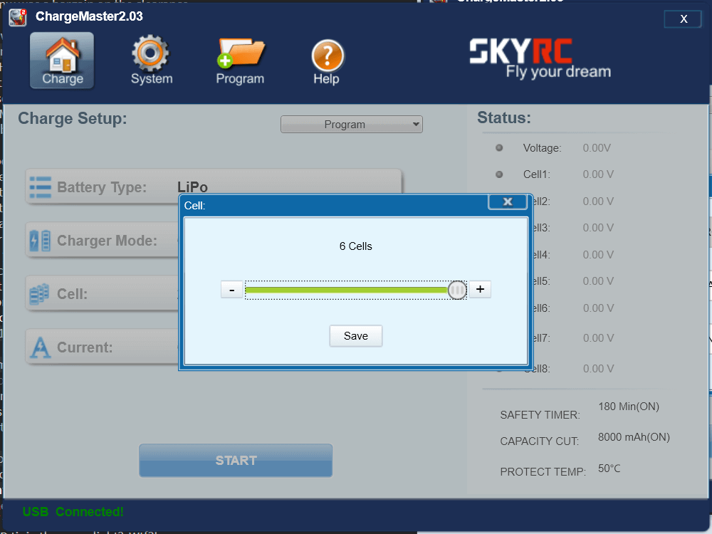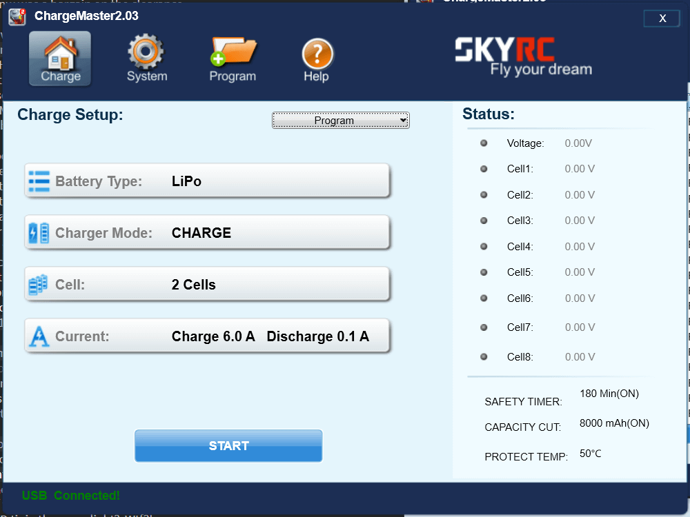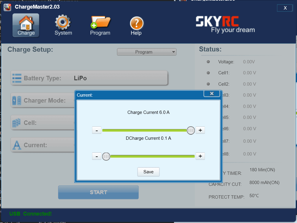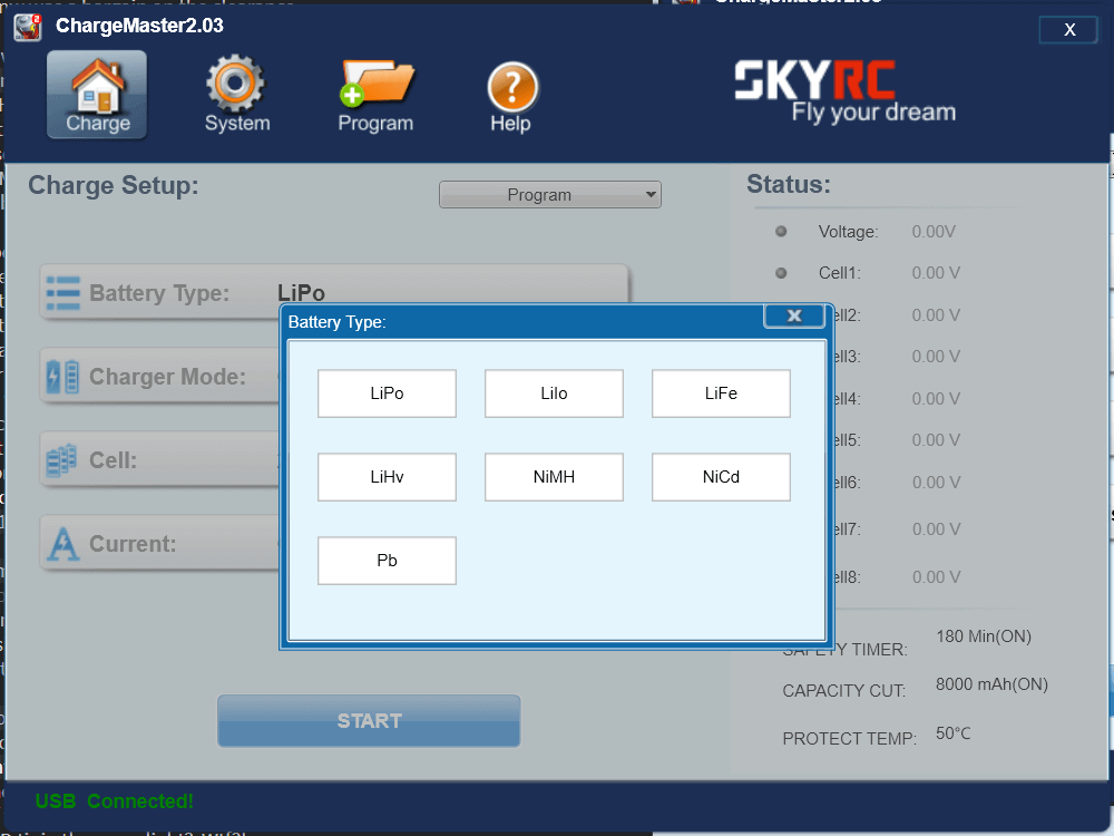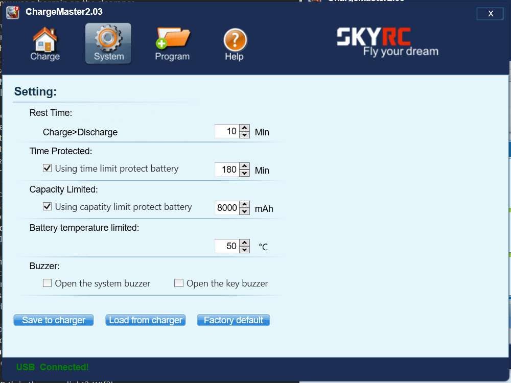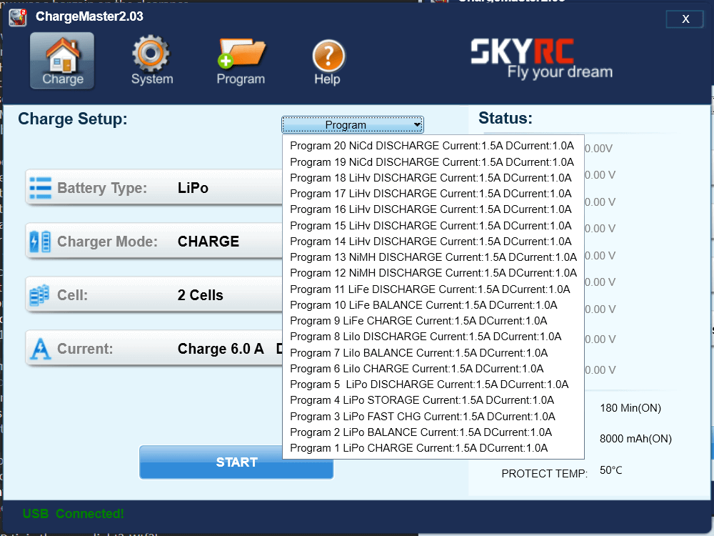 SkyRC is great about expanding the functionality of its chargers by allowing PC access. In this case, provided by a micro-USB “PC LINK” connection is provided on the side of the box. Once connected to a computer, and with the proper software installed (you’ll have to click the “software” tab, I can’t link it directly), a user may load programs (20 choices) and edit those programs (or build new ones from scratch!), for charging cells.