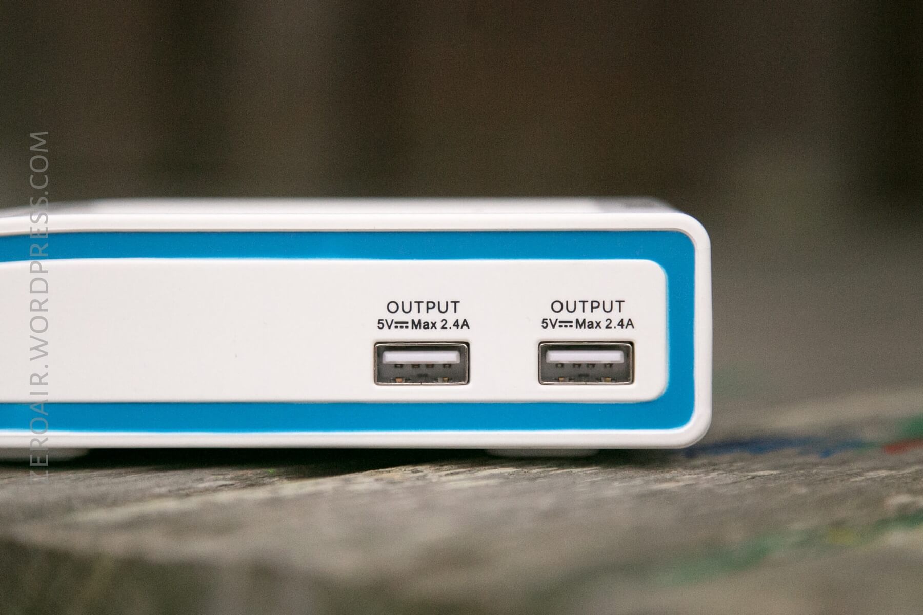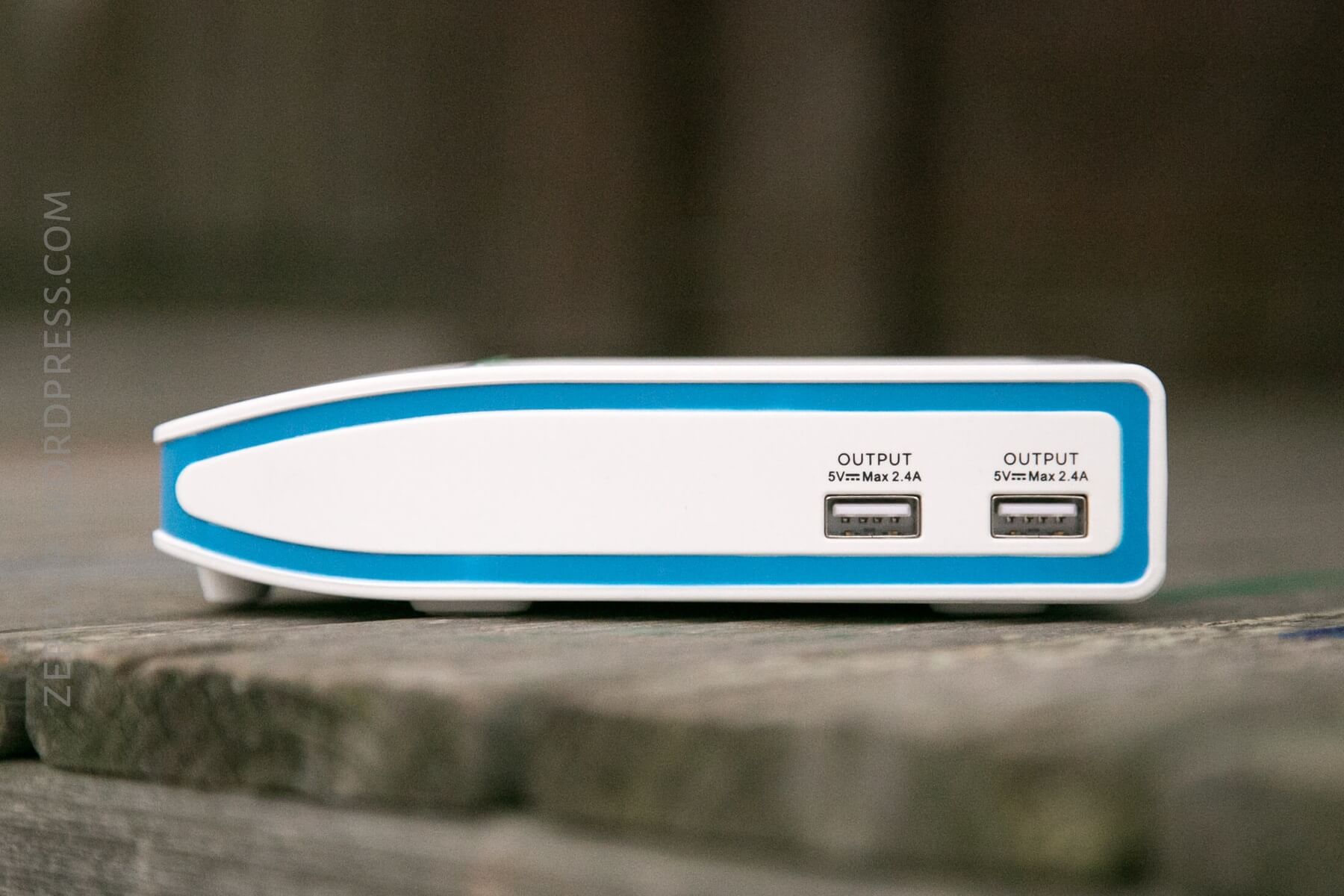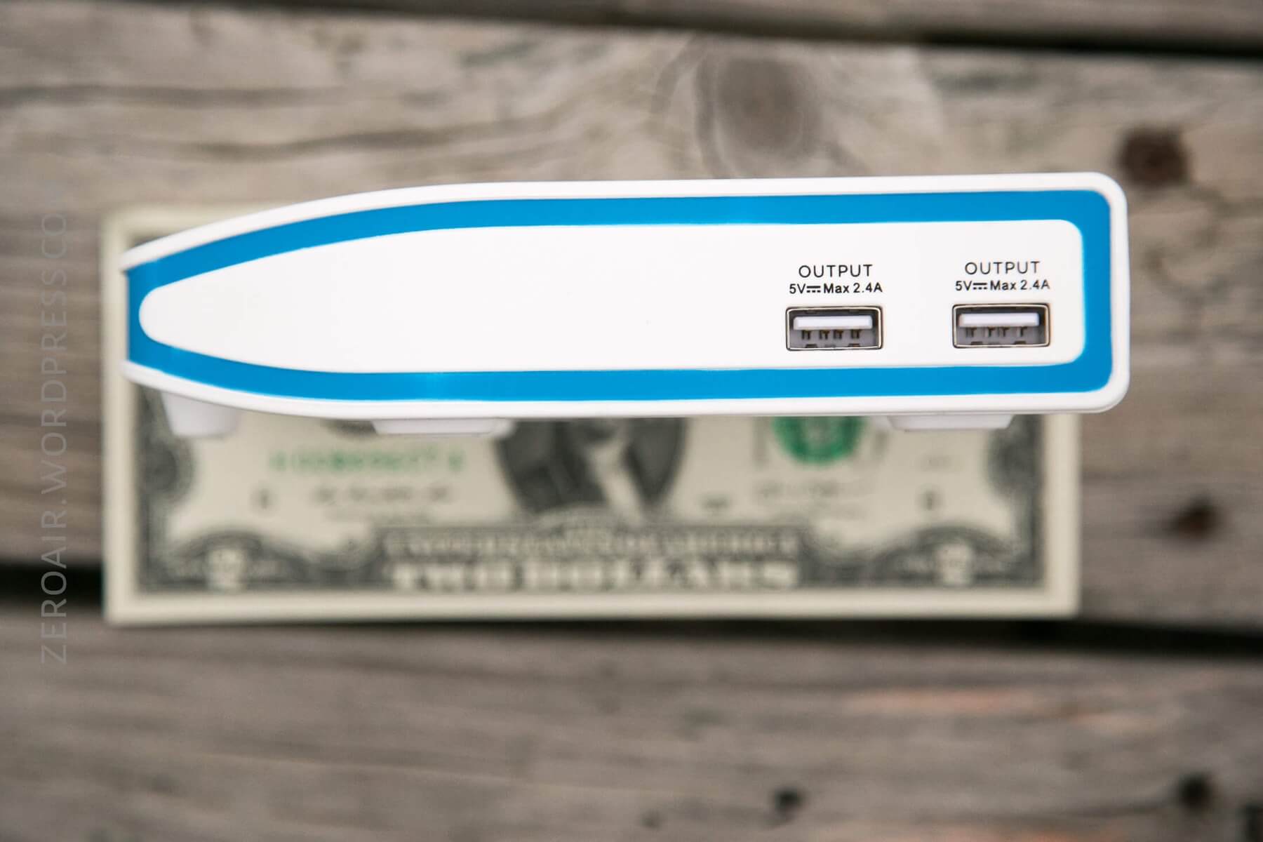 Around the body of the charger, one can see two USB outputs, capable of 2.4A each, and on the back, the barrel plug input.