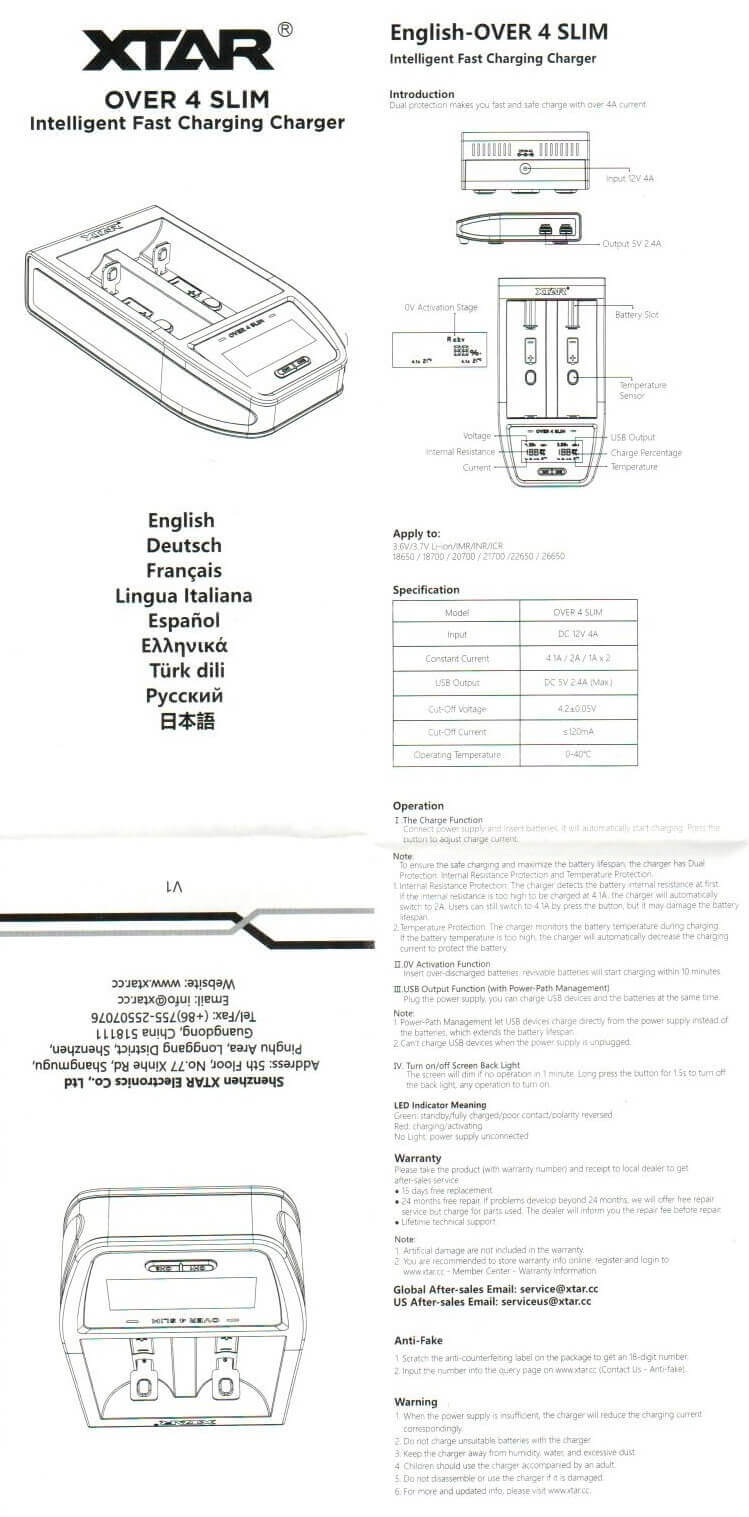 The Over 4 Slim receives power from an included wall wart, capable of 4A at 12V. This is a nicely rated wall wart. Of course, it really must be, since this charger is intended to charge the appropriate cells at 4.1A!!