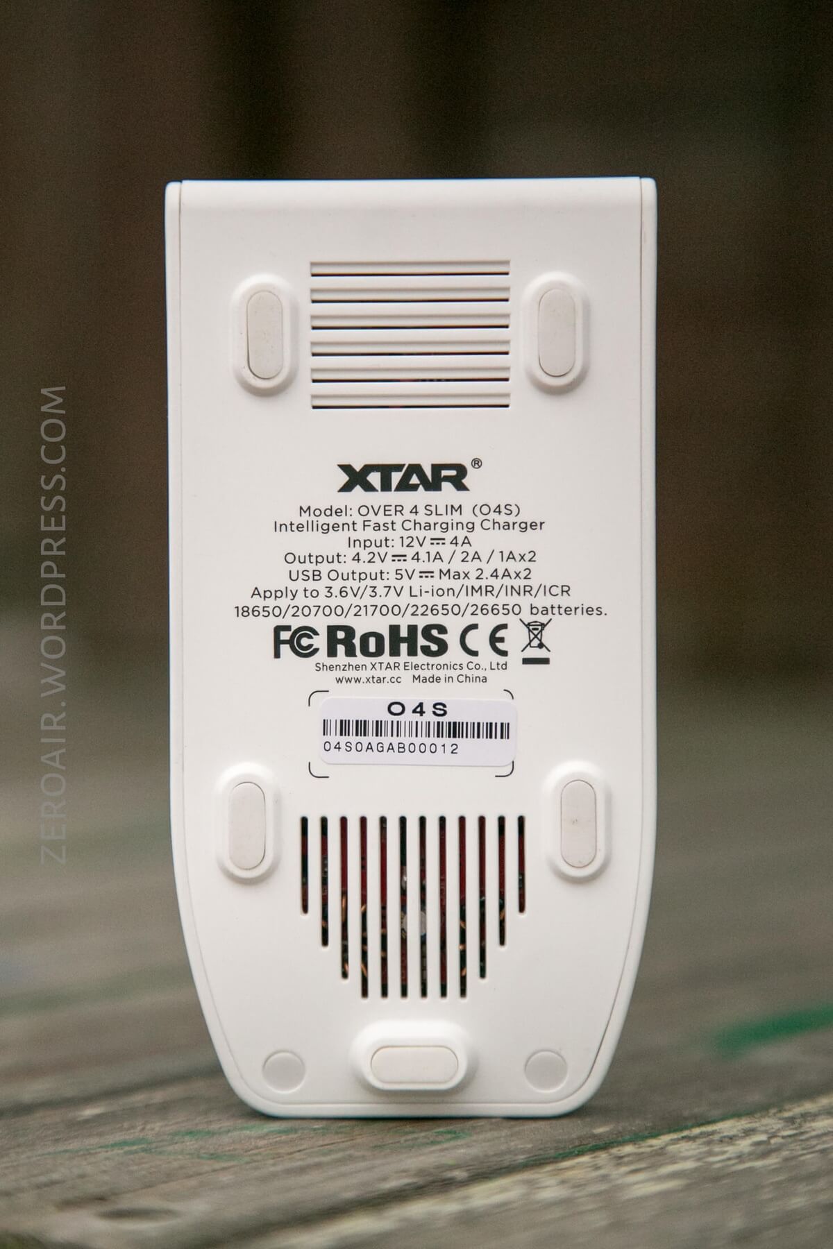 On the back, see the rubber feet that will help keep the charger in place. Included too is screen-printed text of what cells are appropriate in this charger.