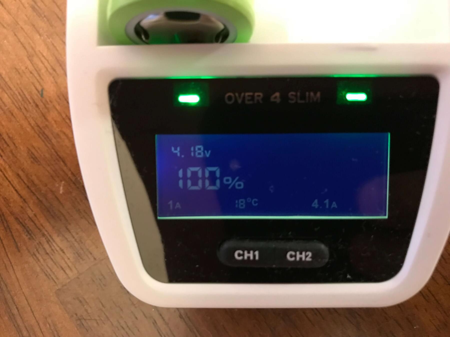 Aside from being able to charge cells quickly, the Over 4 Slim can also output loads of current. There are two USB outs, which are each capable of 2.4A. I was able to test these individually, but not concurrently. I can confirm that they are both capable of 2.4A, and voltage only dips to around 4.7-4.8V. Above 2.4A, the output drops out and turns off.