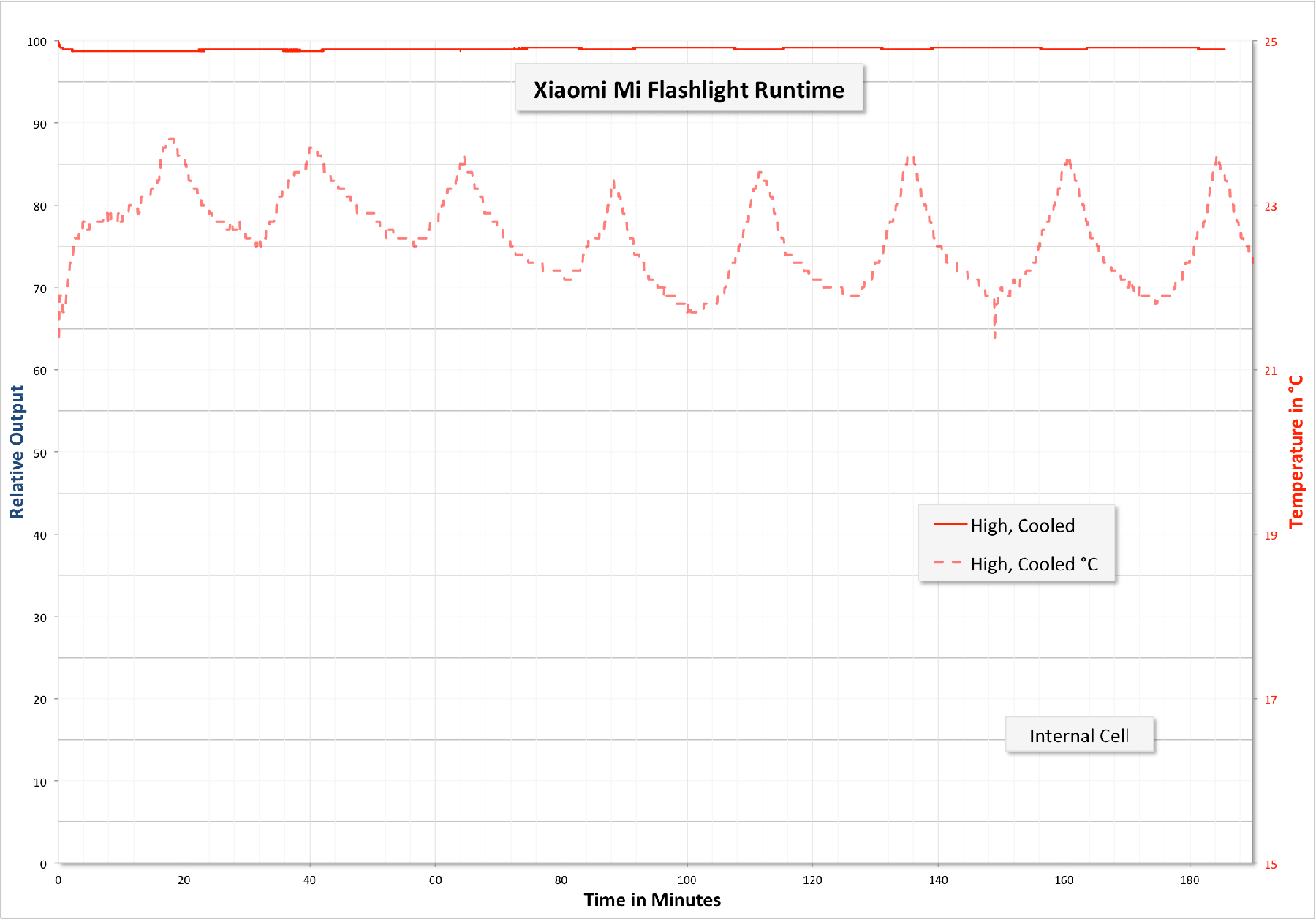 That output is quite unusual – almost perfectly flat until the light shuts itself off. There’s no stepdown, no nothing else. Just solid runtime until off. The rated runtime on this mode is 216 minutes, but the light falls a little short of that. It looks like the output might vary with room temperature in fact, but only very slightly (probably the difference in emitter efficiency at 22 vs 24 degrees, as specific as that seems.)
