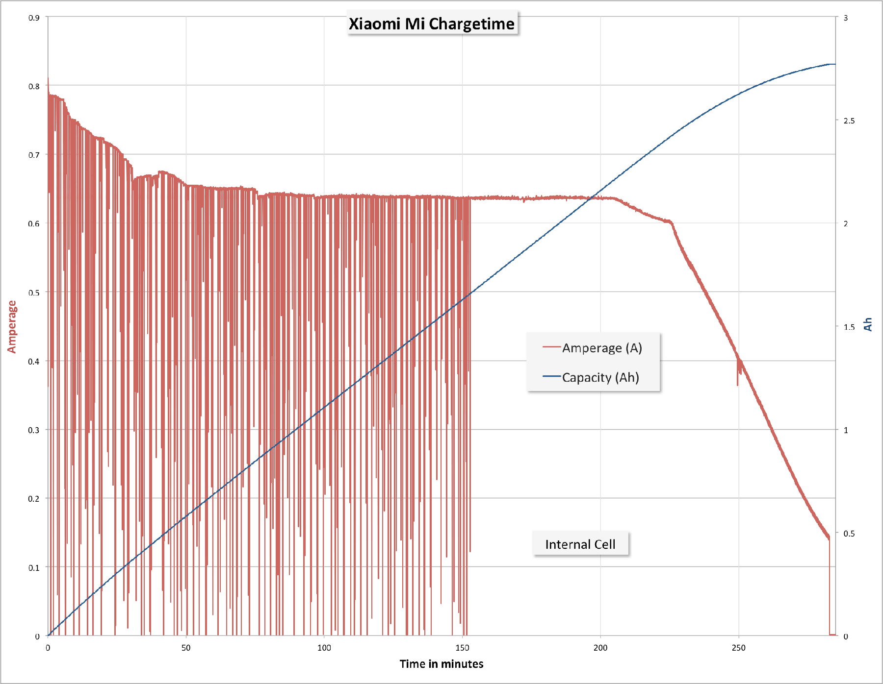 Below is a charge test, starting at the end of the runtime above. The initial rate is around 0.8A, but stabilizes at around 0.65A. I am not sure why there are dropouts as seen up to 150 minutes, but that seems to stop, and charging continues as it should. The cell looks to be around 2600mAh, which again is reasonable for an 18650.
