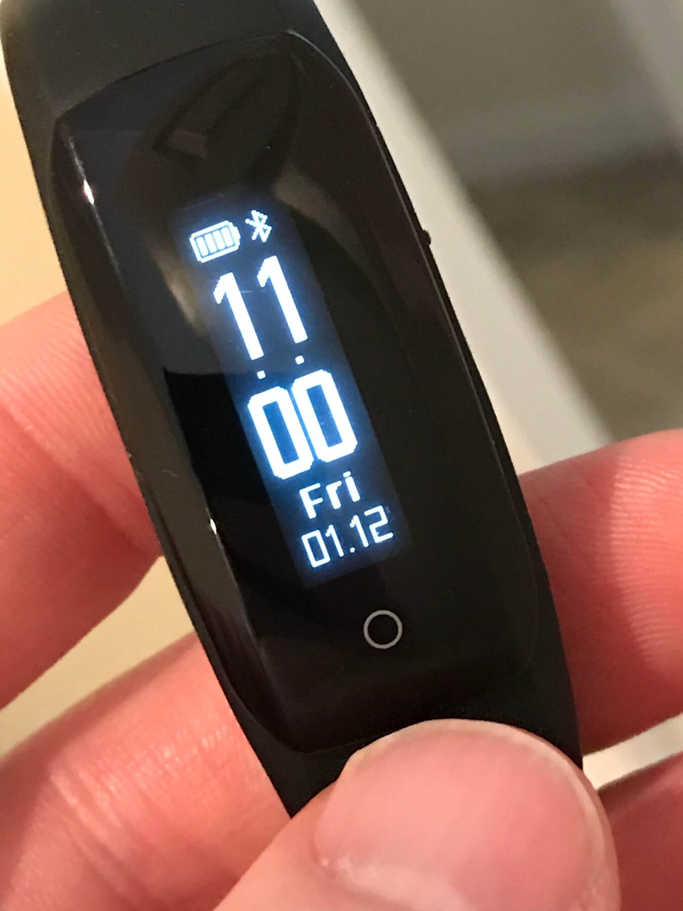 When the device is active (screen is on), holding the button brings up the “local settings” menu very briefly, and three actions can be chosen: power off, sport, and return. But to activate any of these options, one must click the circle button repeatedly, select the different options, and a second or two after release, that item will be selected. If you select power off, the unit will tell you “Bye”! To turn it back on, hold the circle button. It’ll say “welcome” and vibrate. If you select and start the “running man” option, a recorded session will begin and track heart rate, time, and distance. Holding the circle button again will stop the session. I have not explored the recorded tracking. The final option just returns the device to the time menu.
