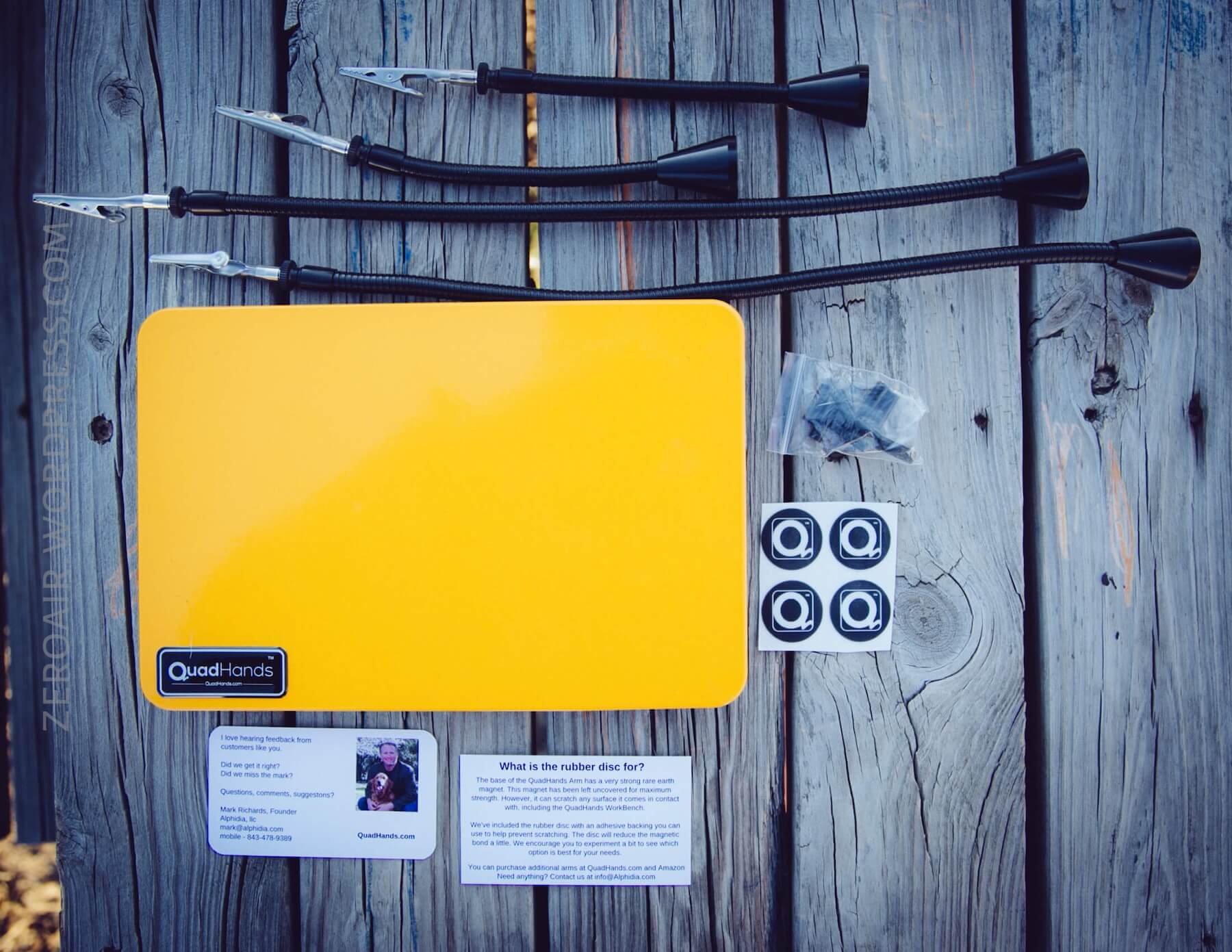The QuadHands ships in a cardboard box, with all parts of the base. This way it ships flat. The manual is… honestly not really necessary. But QuadHands does include a couple of business cards printed