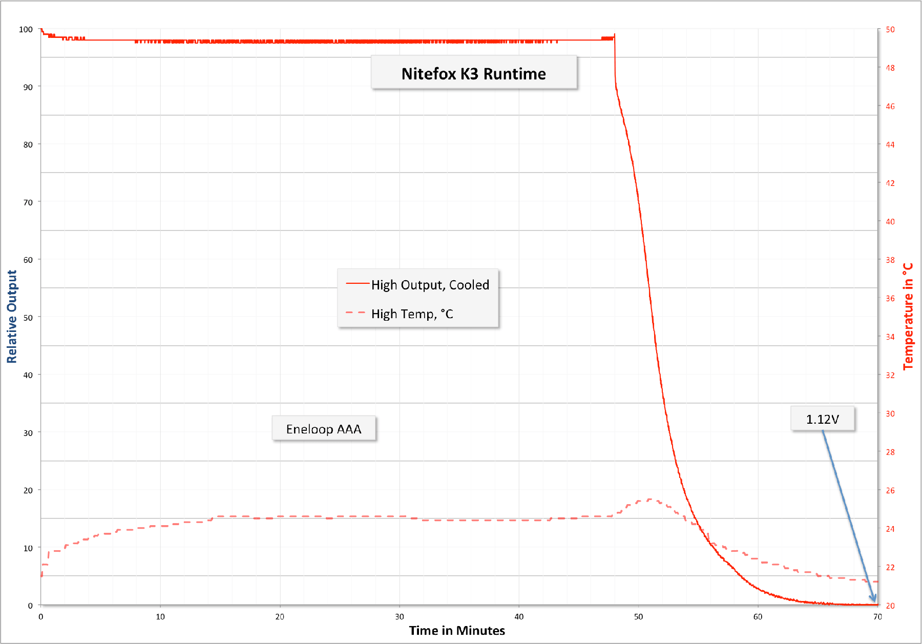 Here’s a runtime on high. Output is surprisingly stable for 45 minutes. Very respectable. There isn’t a proper low voltage protection, but the light does switch over to a very low strobe, so any active user would take note of this.