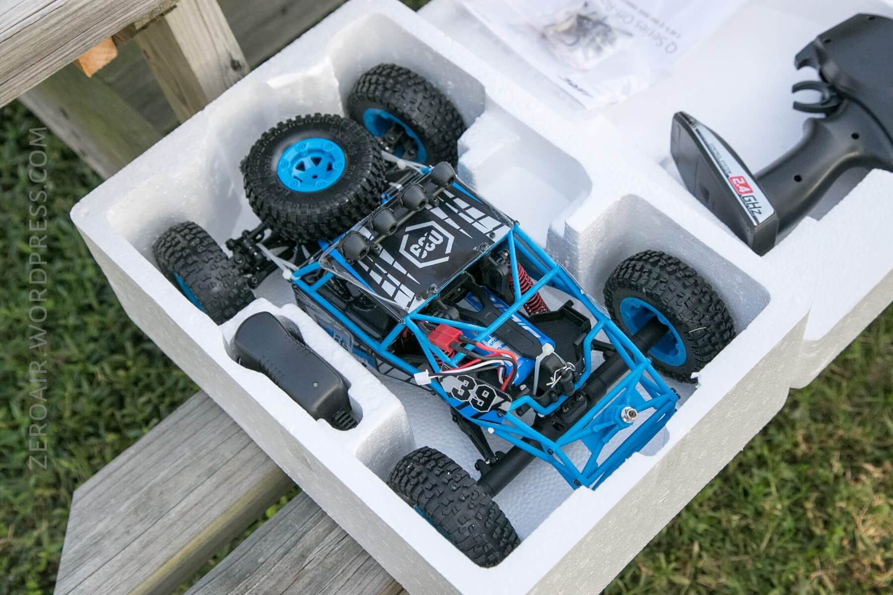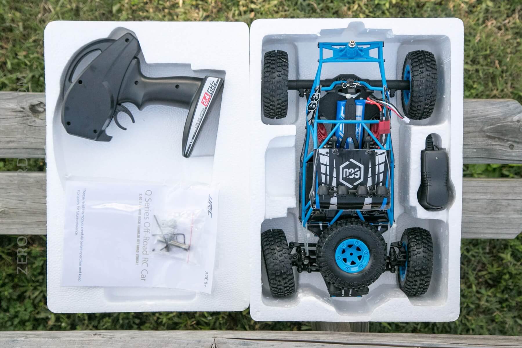 The RC car ships in a large cardboard box. The car and parts are secured in styrofoam.