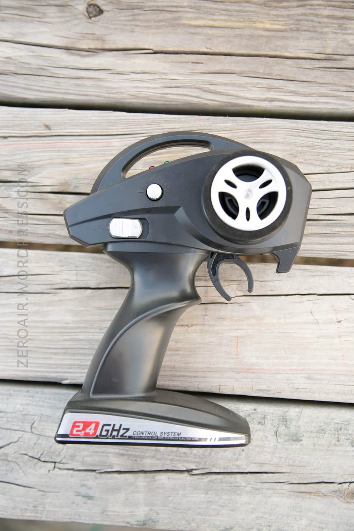 Provided with the kit is a 2.4GHz gun-style control. It’s a right-hand specific unit, and the steering control is achieved with the wheel seen below.
