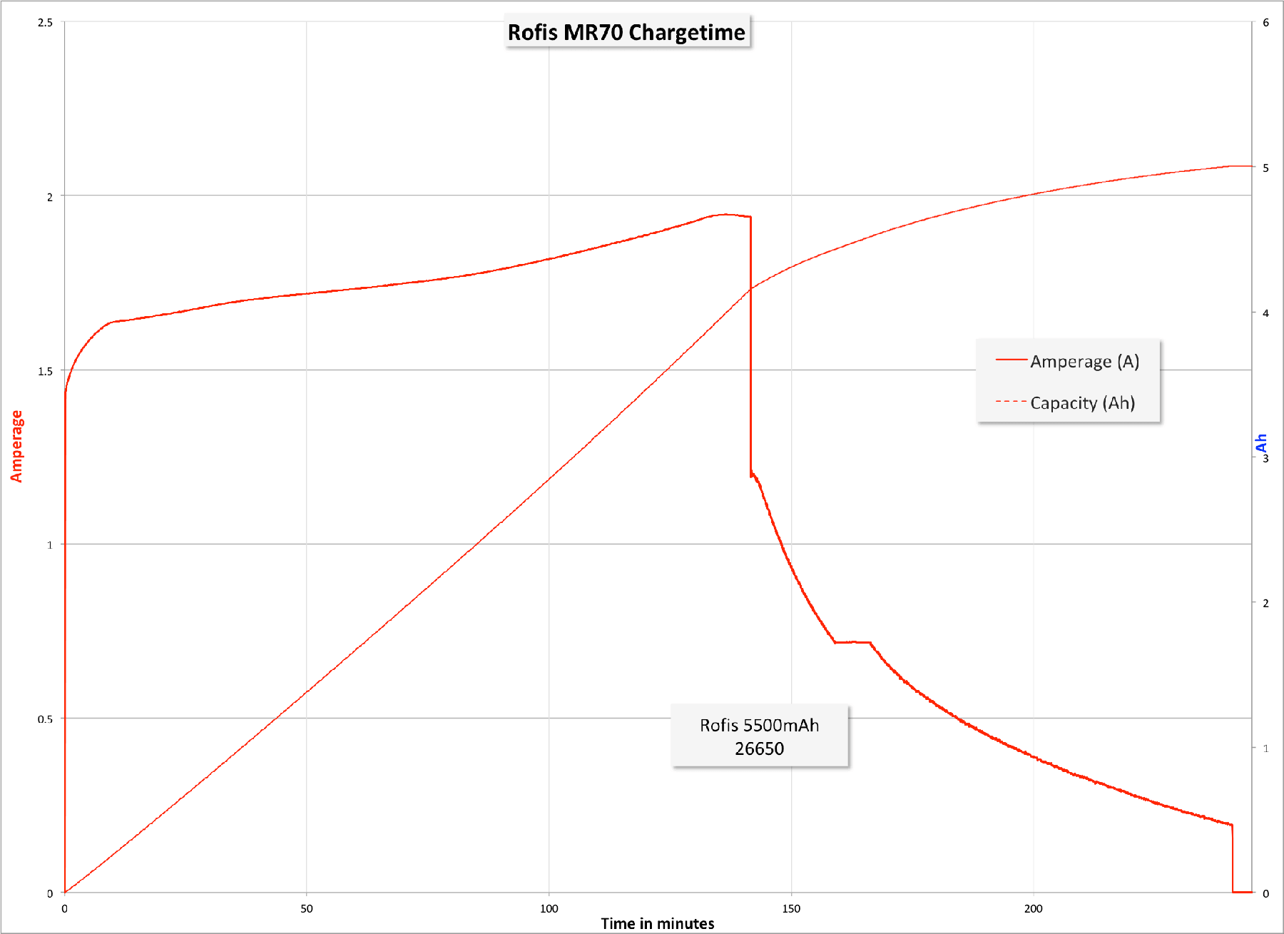 Rofis claims 2A charging, and I found that charging happens at about that rate. In any case, it’s “good enough” charging. Unfortunately, the cell doesn’t test at nearly the rated capacity of 5500mAh.