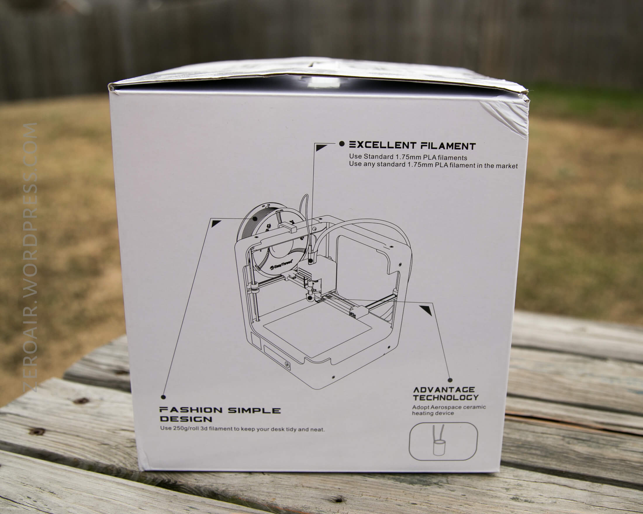 The Nano arrives in a nicely printed box, with general specs and features printed.  The box fits the printer very well, with no slop.  GearBest has its inventory sticker on the box, of course.