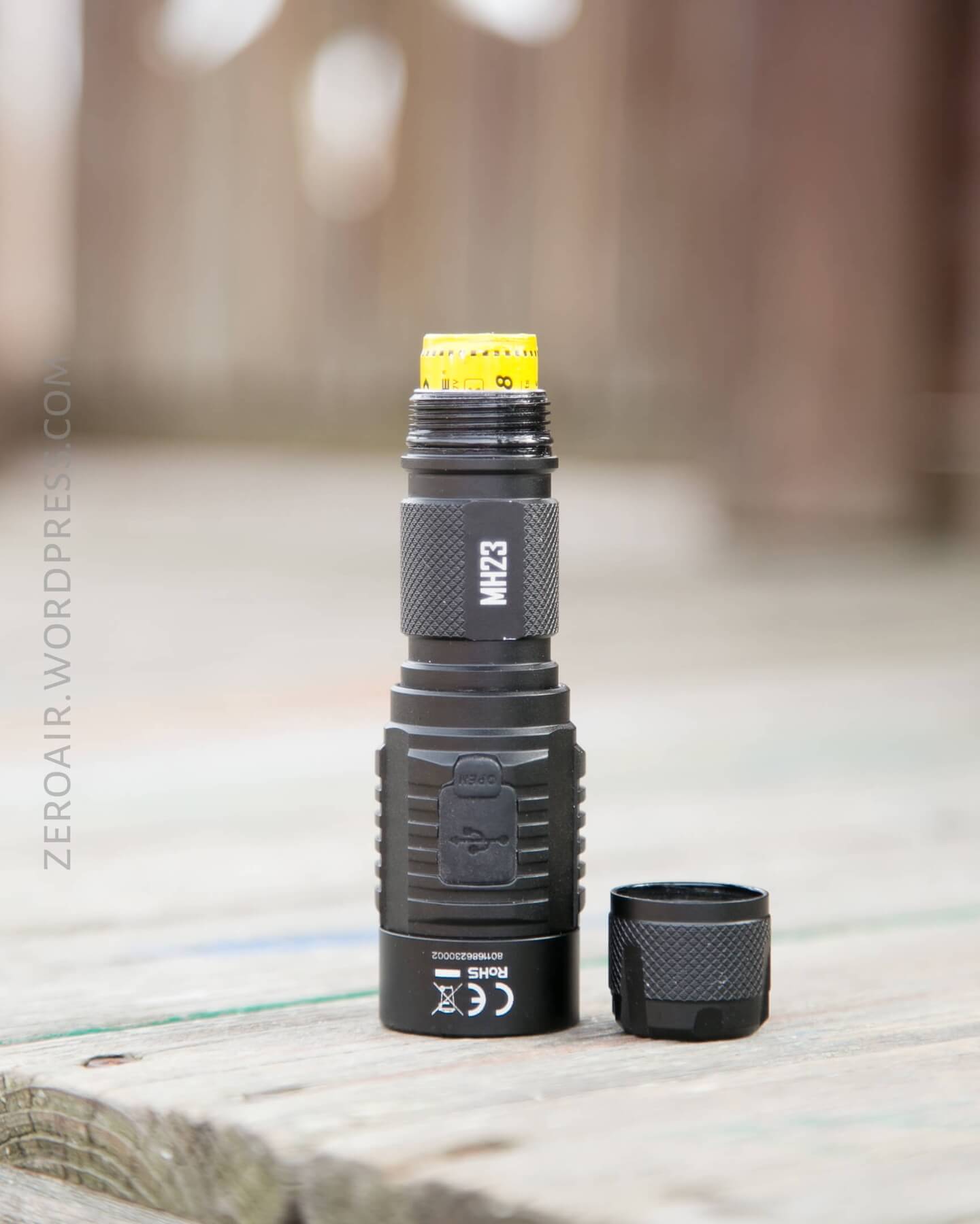 The MH23 is a 18650 light. The head end has a brass button, and there’s a large spring on the tailcap. As a result, the MH23 works with any type of 18650 (flat/ button; protected/ unprotected). Seen below is a rather long Nitecore cell, which naturally sticks up this far. The tailcap has long threads, and a cell sticking out this much isn’t a problem at all. Nitecore does recommend a cell capable of 8A discharge.
