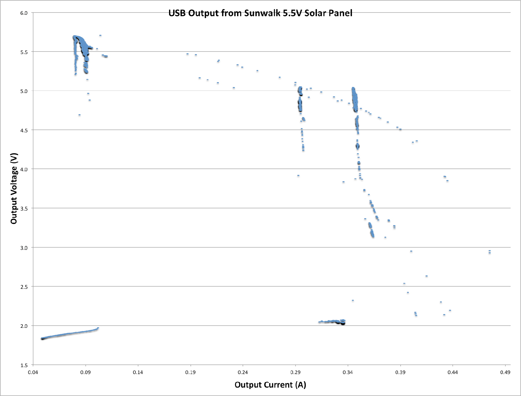 I tested this output a little, under full sun. As you can see, when the voltage is high (ie, very full sun), the current can be as high as 0.5A. In truth, I’m not sure the best way to describe these results, as I increased the load on the panel, the voltage output went down dramatically (voltage sag). So in some cases where the voltage is low, it’s because there’s full sun and the panel is supplying more current, but there’s a lot of voltage sag.