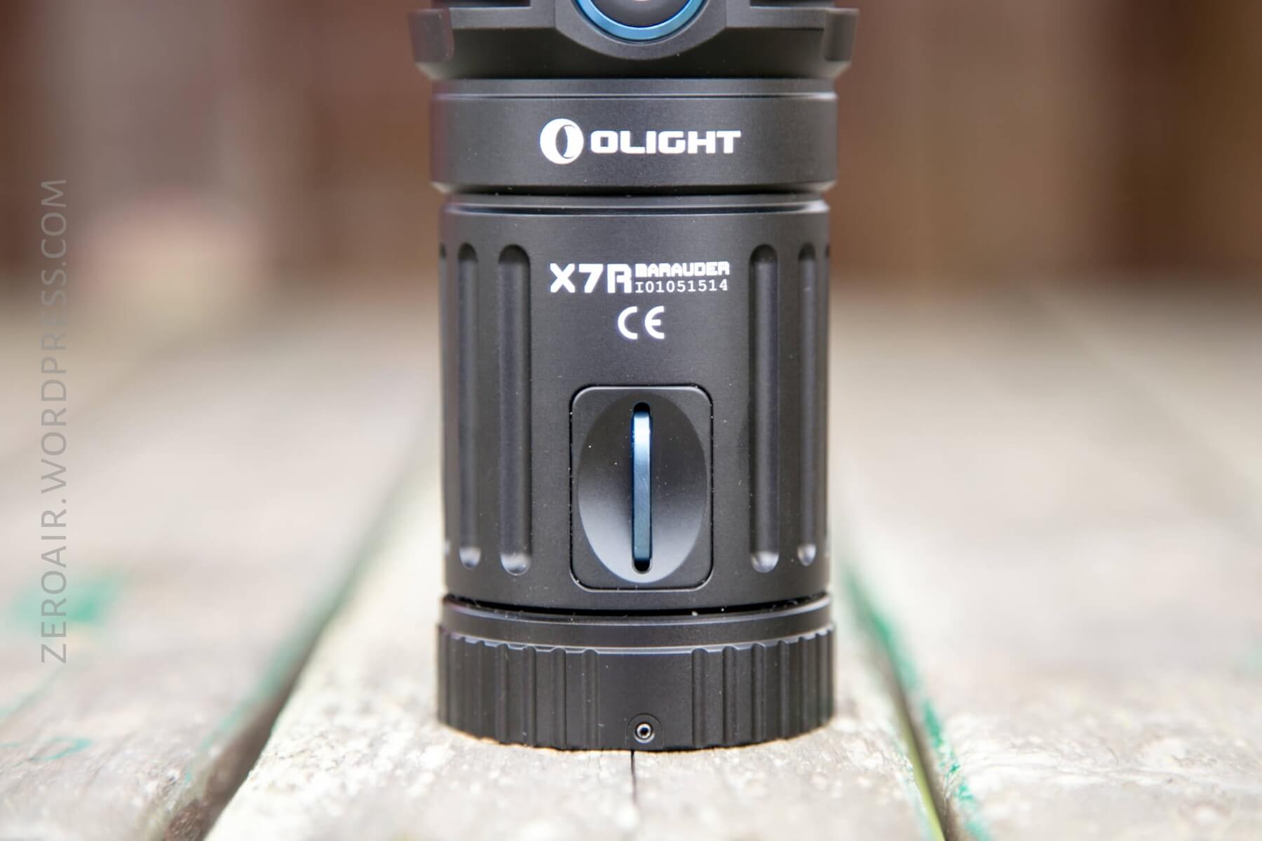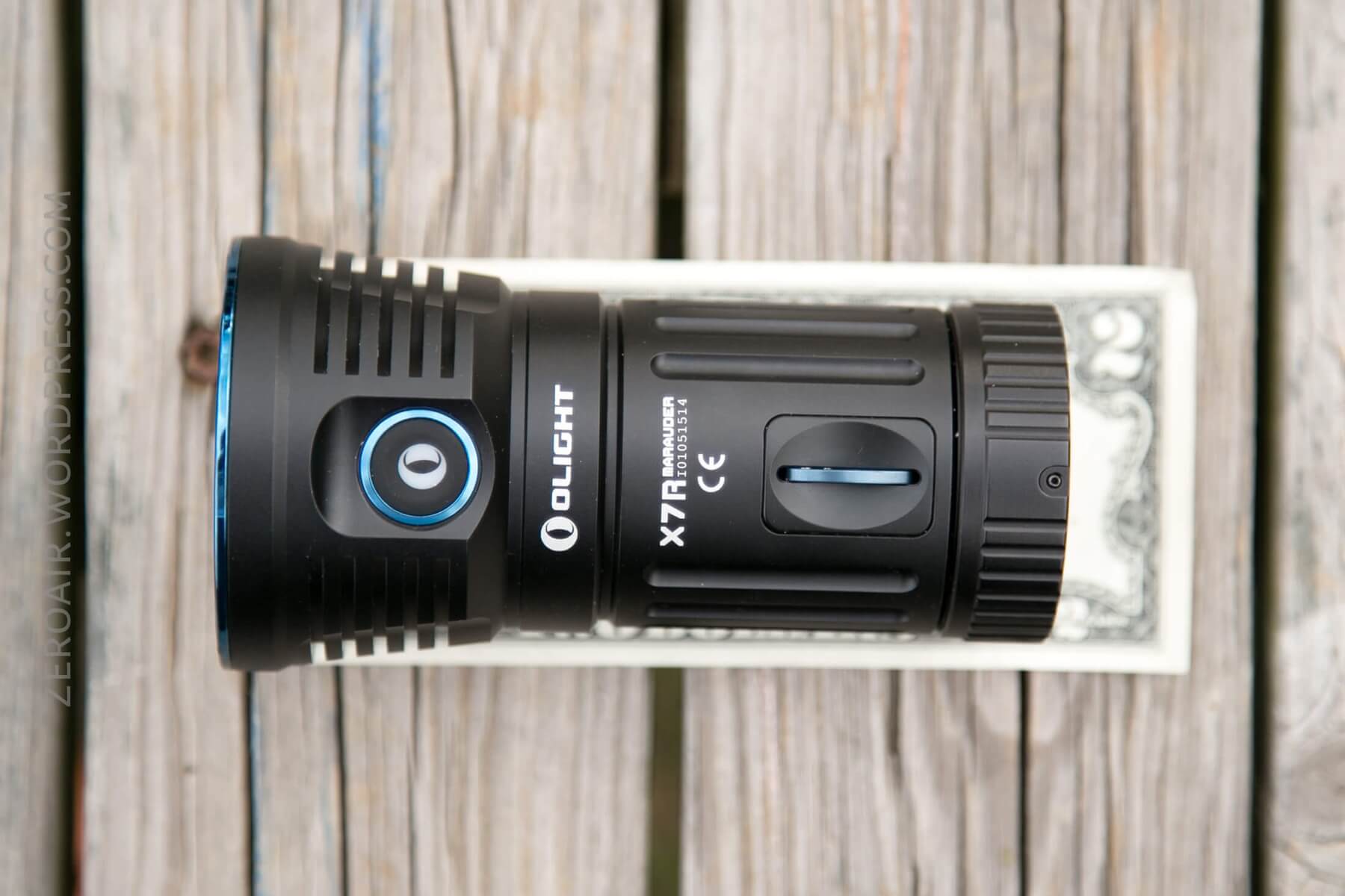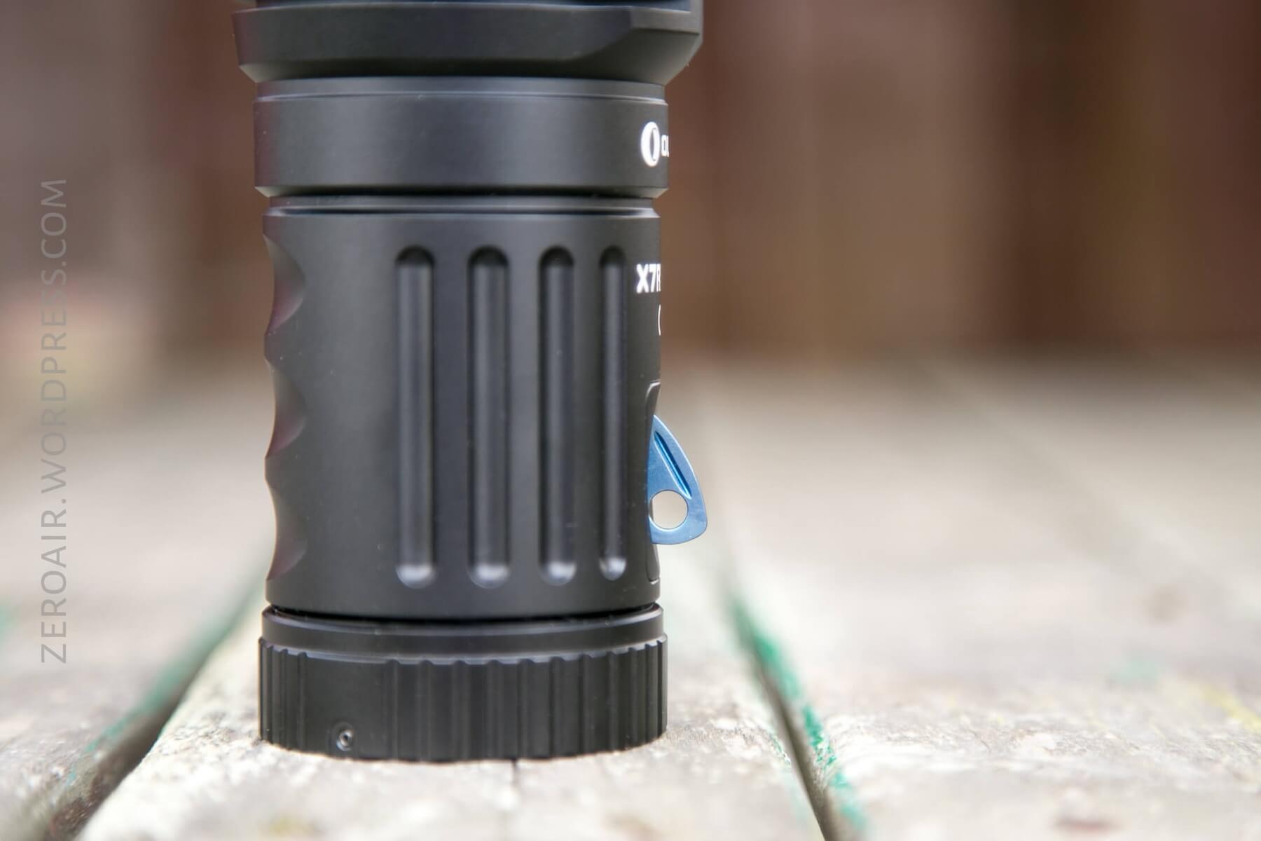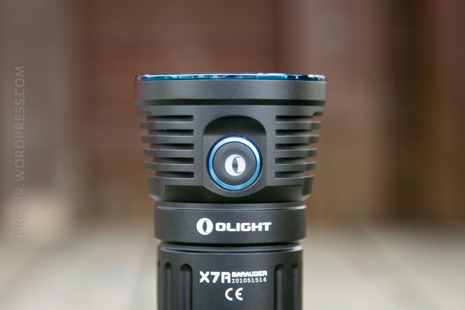 There’s a single button on the Olight X7R. It’s a clicky, silicone button, with a bit of a double shape. The button is rounded, but in the larger center, it has a crater. In the center of the crater is a little button. It’s an unusual button, but quite pleasant to click.
