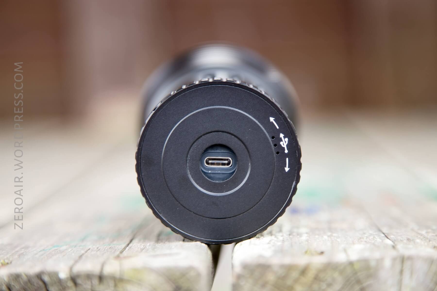 The USB-C port is on the tail of the light, accessed by twisting the tailcap. When the tailcap is twisted, the little blue door slides out of the way to reveal the port.