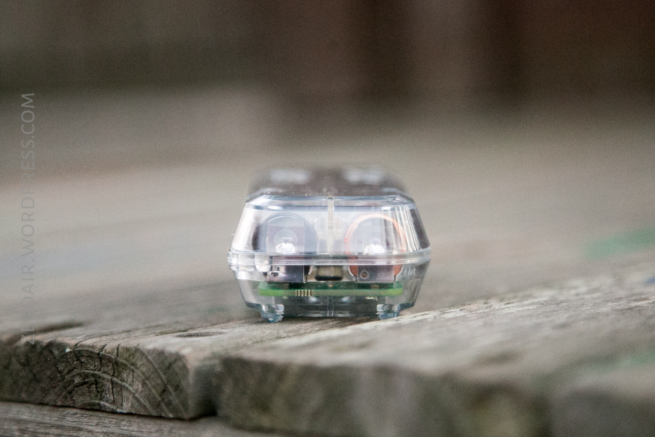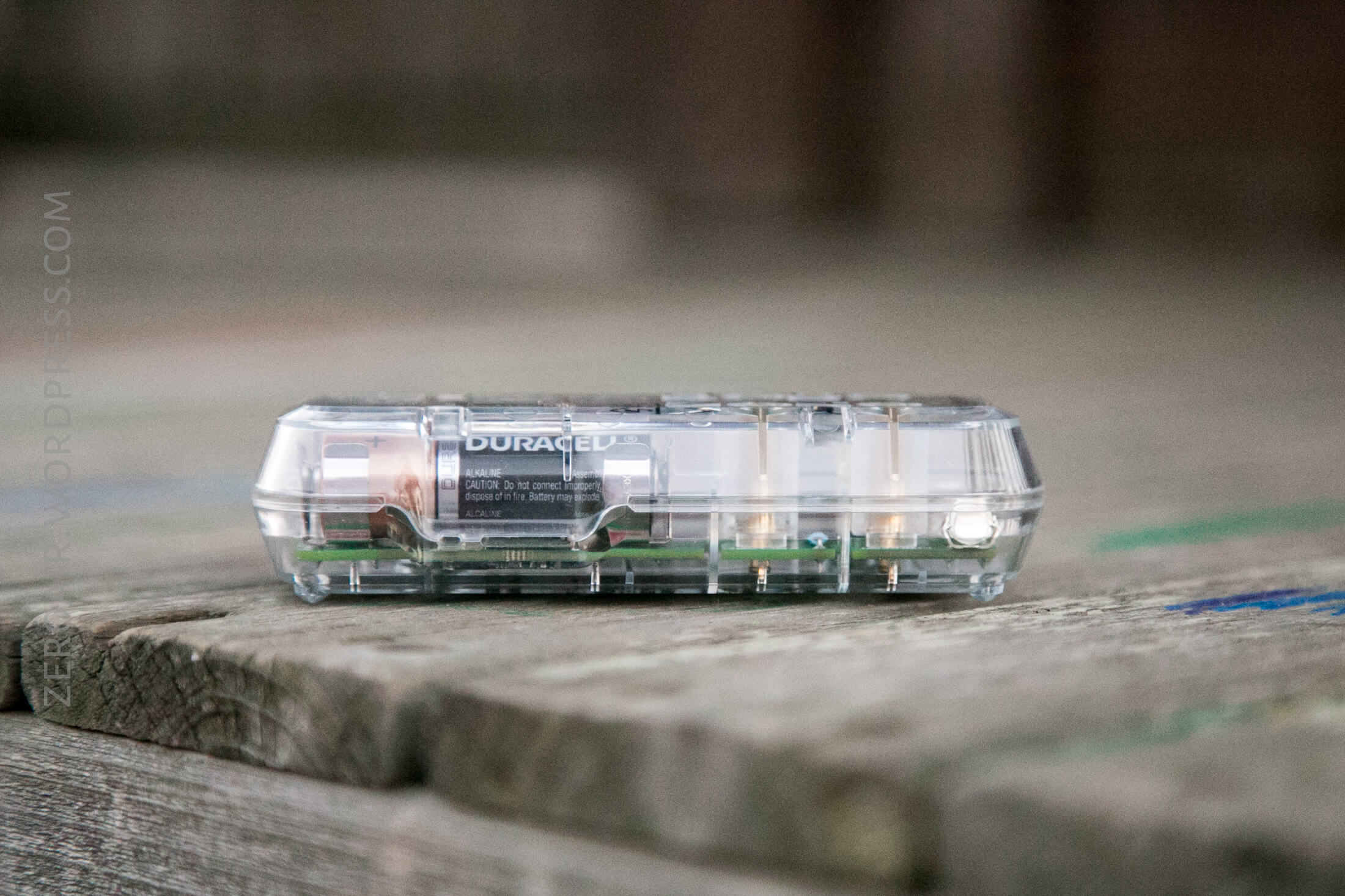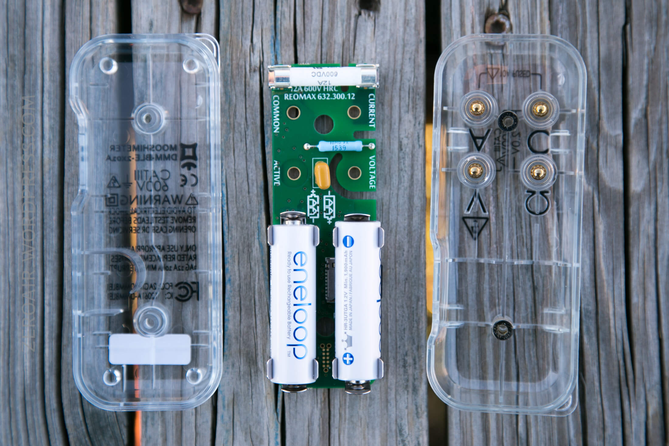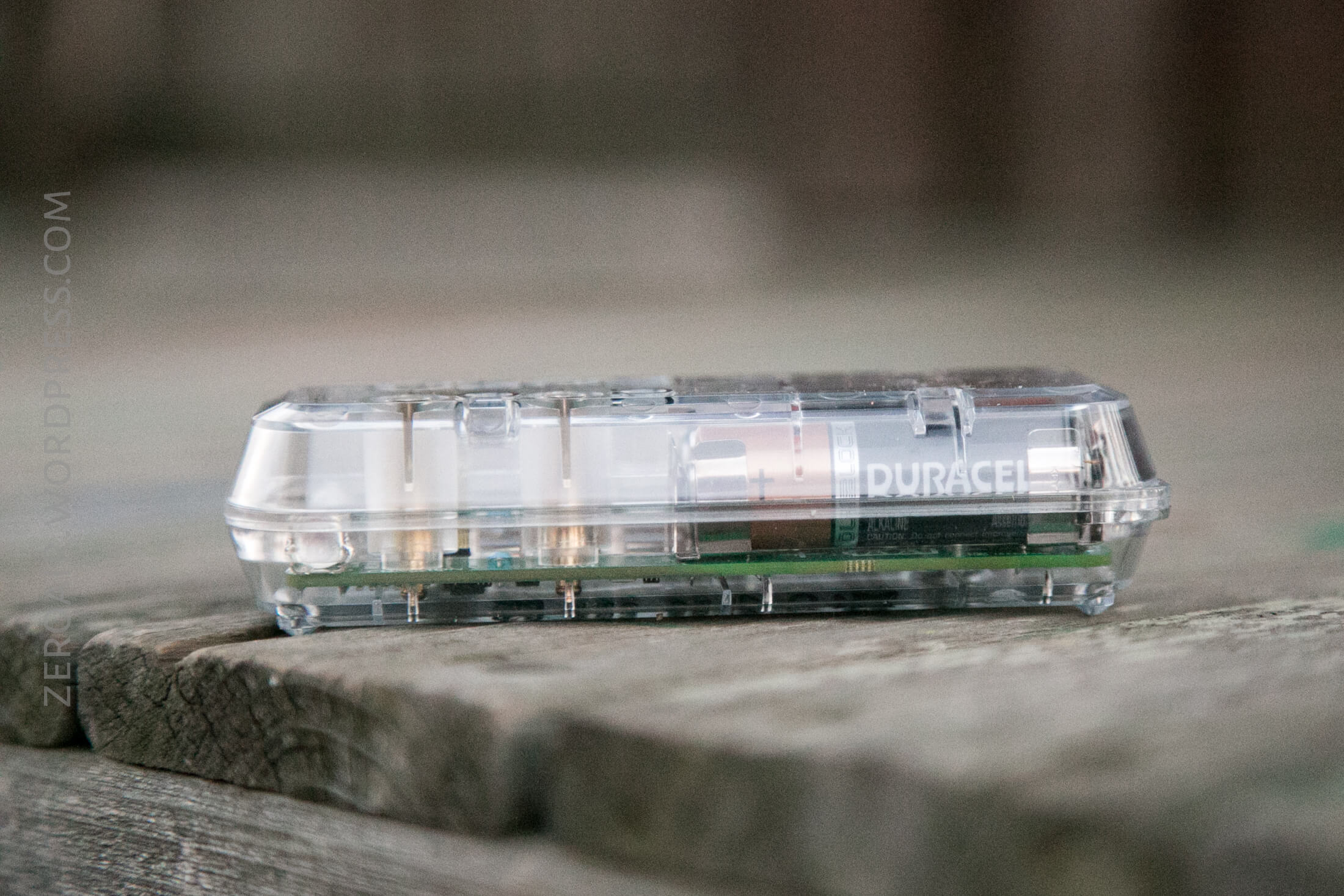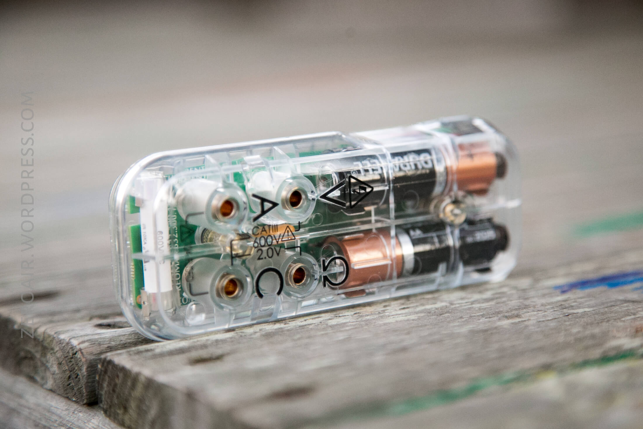 A transparent plastic device showing internal electronics and two AA batteries standing side by side on a wooden surface, with various symbols and labels visible on the case.