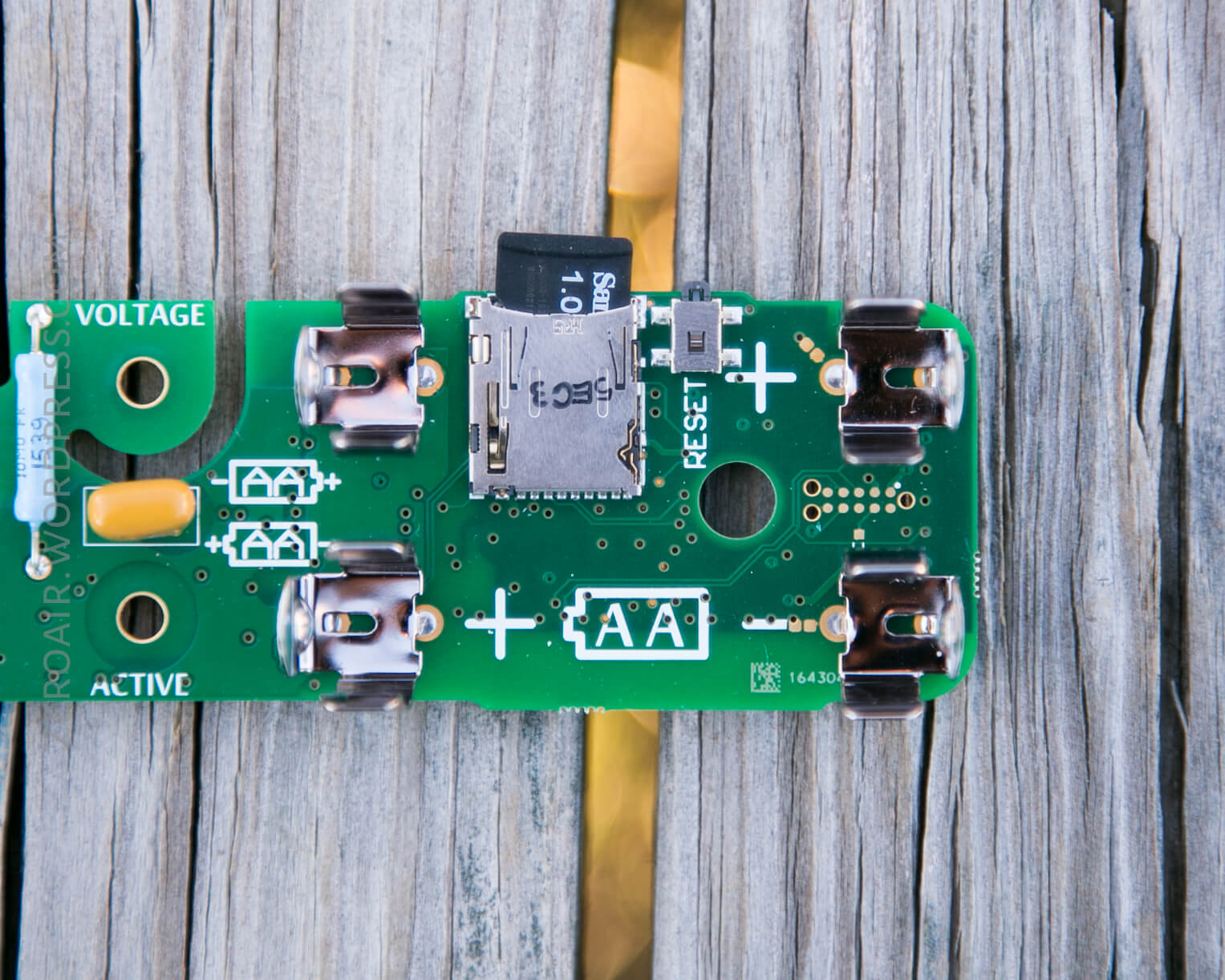 The top side of the PCB, with the two AA cells removed.  Very fortunately, there’s screen printing on the PCB to show which direction the cells should be installed.  Two places in fact – one of which can be seen when the cells aren’t present, and one that can be seen when the cells are present.  This is fortunate, because coupled with the clear case, it can be seen if the cells are installed correctly.  Clever (and handy).