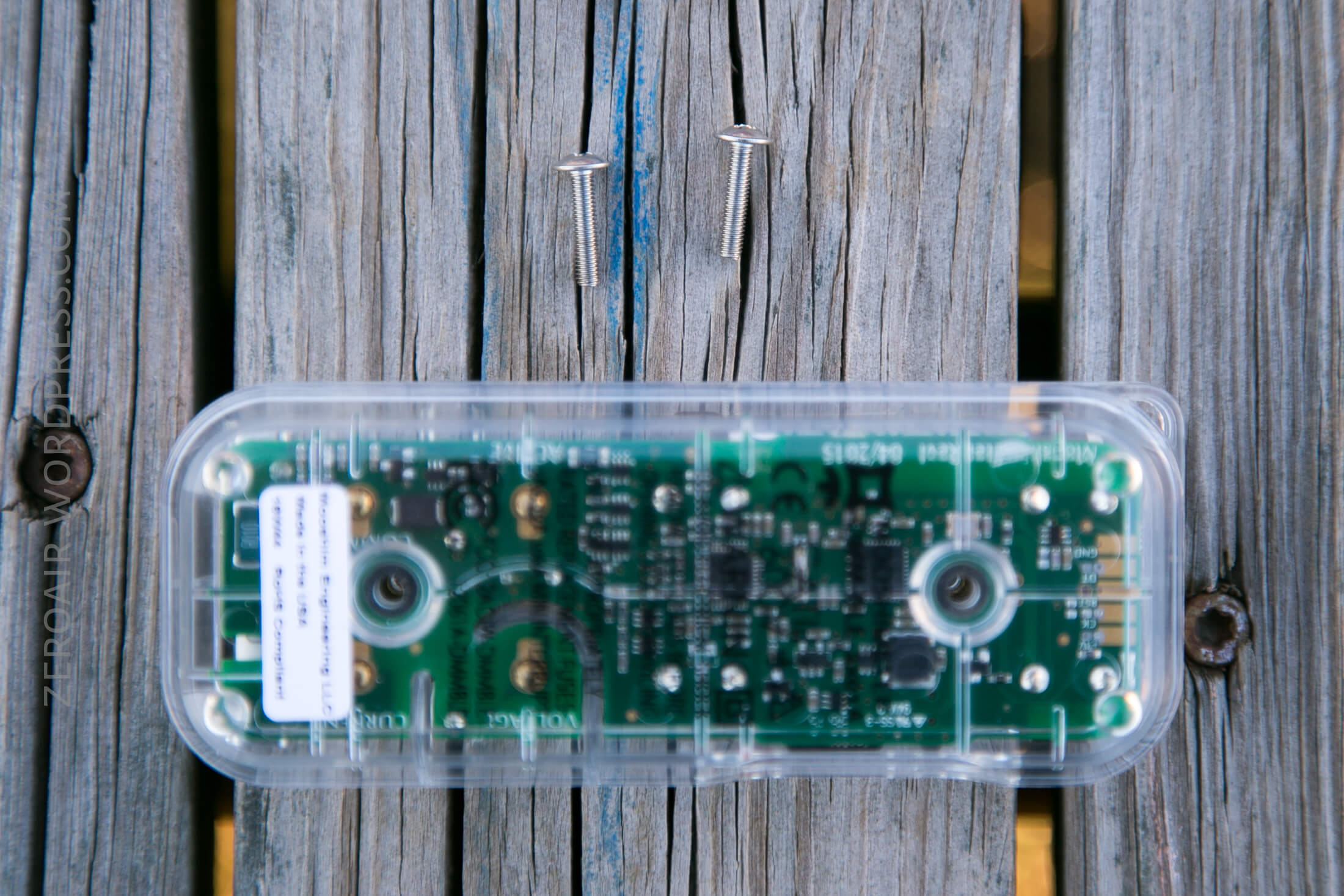 Here are the two screws, removed.  They’re quite long with small threads.  Removing them often will get old, to be sure.  And absolutely requires a tool.  If I’m honest, I’d love to see some kind of attachment for the back of this unit – maybe a suction cup, or rubber feet, or… something.  For example if there were 4 feet, thumb screws could be added, making for tool-less entry for cell changes.