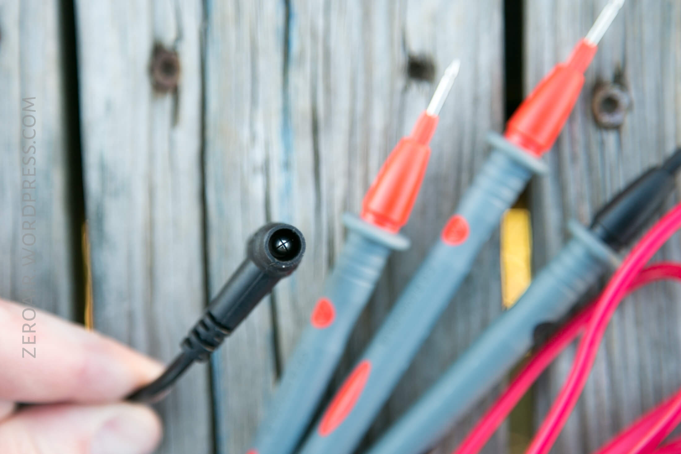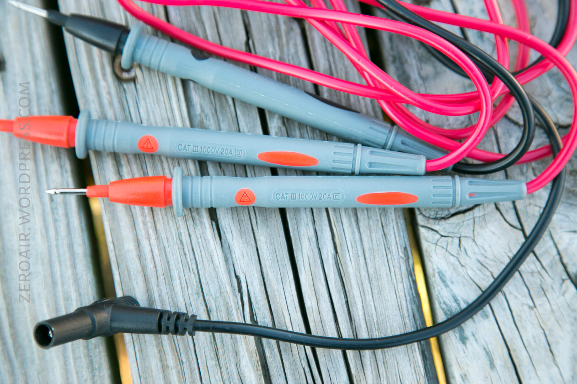 Three leads are provided.  They’re fairly nice leads, with good coloring (two red, one black).  They have right angle banana plugs, and very sharp tips.