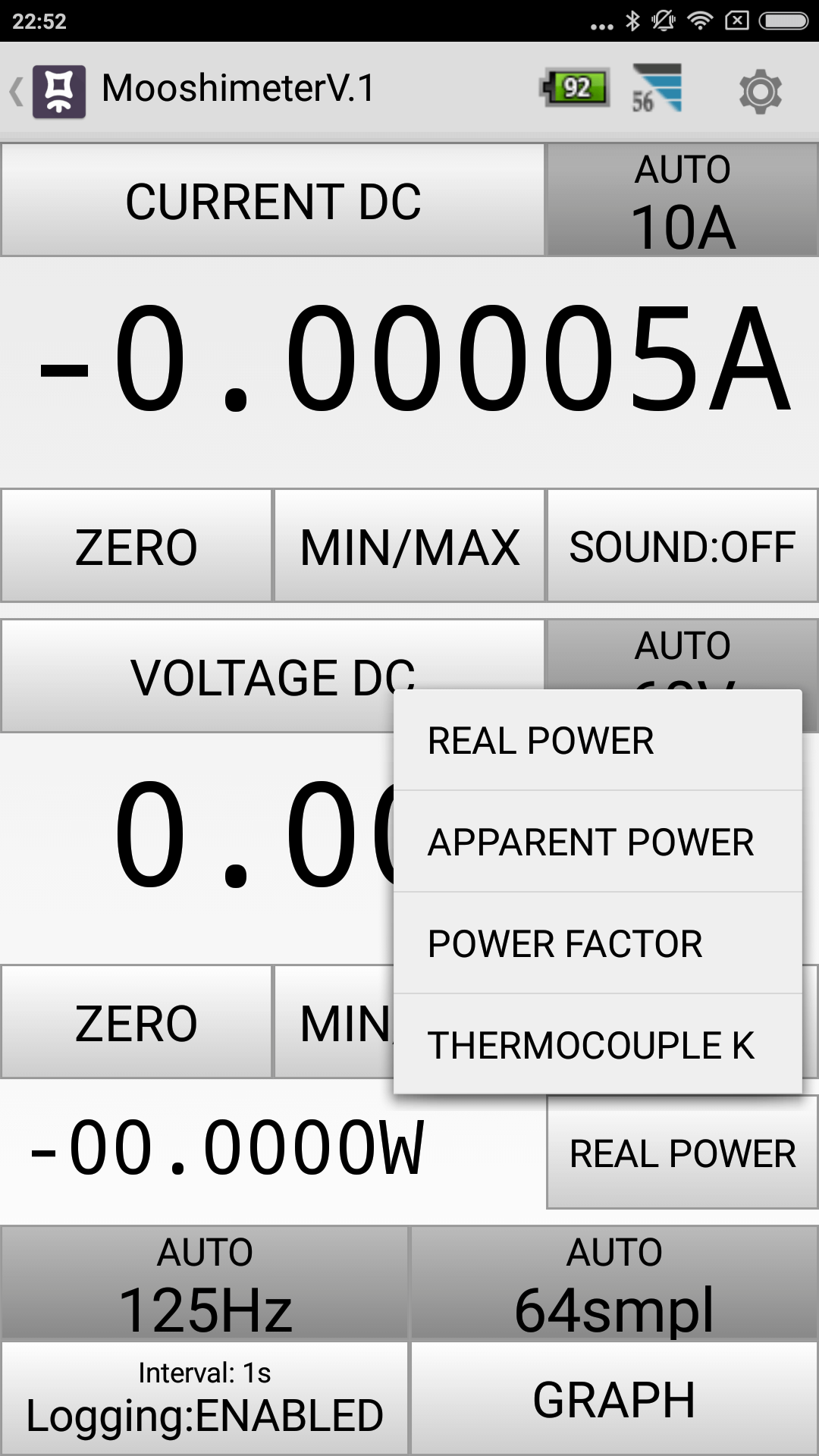 On to some in-use shots.  Below is a graph that just sort of runs in the background while the meter is in use.  If the phone (or “device,” but I’ll say “phone” to differentiate between the “Mooshimeter device” and “display device” – but other display devices do work) is flipped sideways, the graph comes up automatically.  Flip the phone back vertical, and it switches back to the number display.  I am not sure if this graph is exportable – I believe it is.  Much more useful is to log this data and plot it manually.
