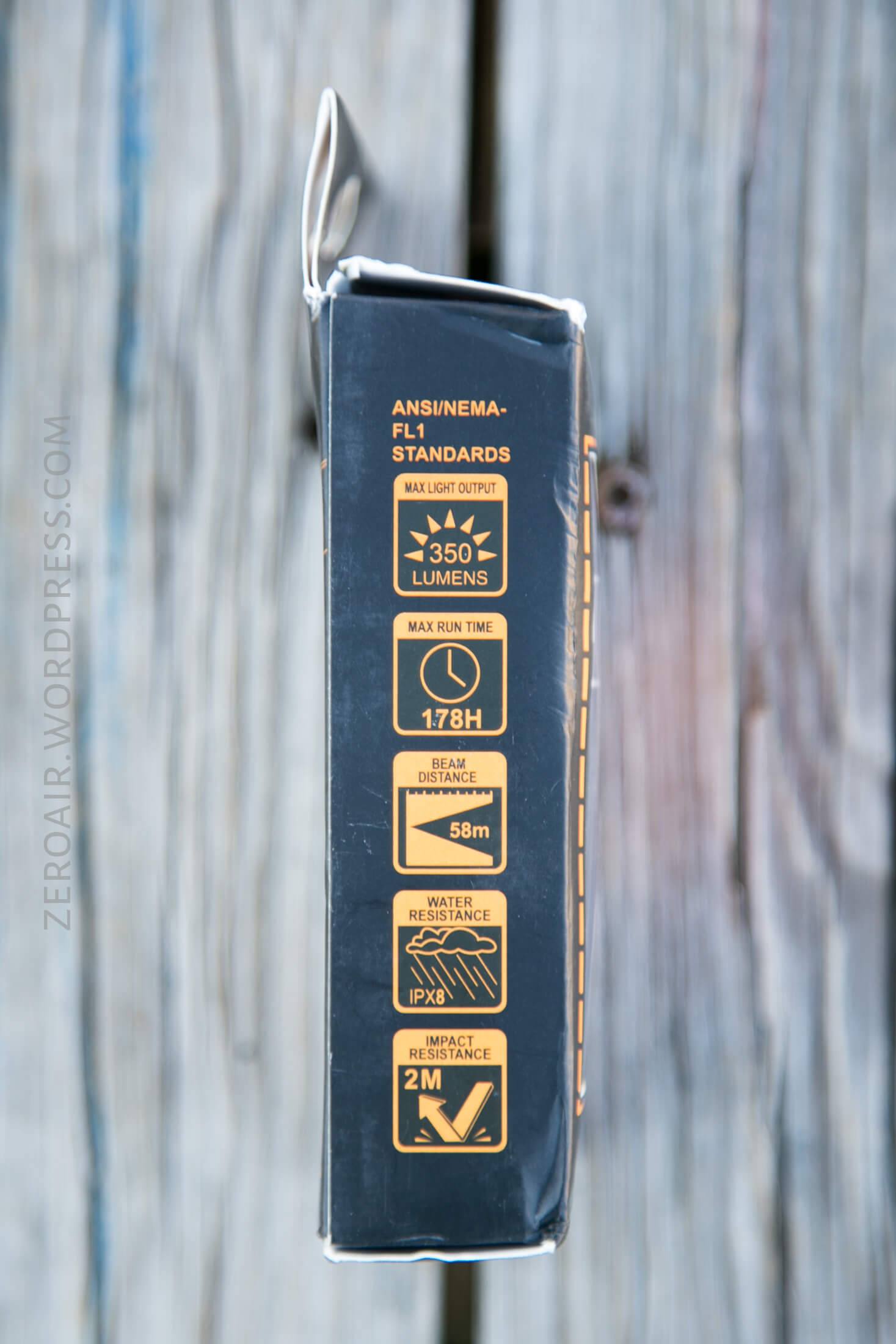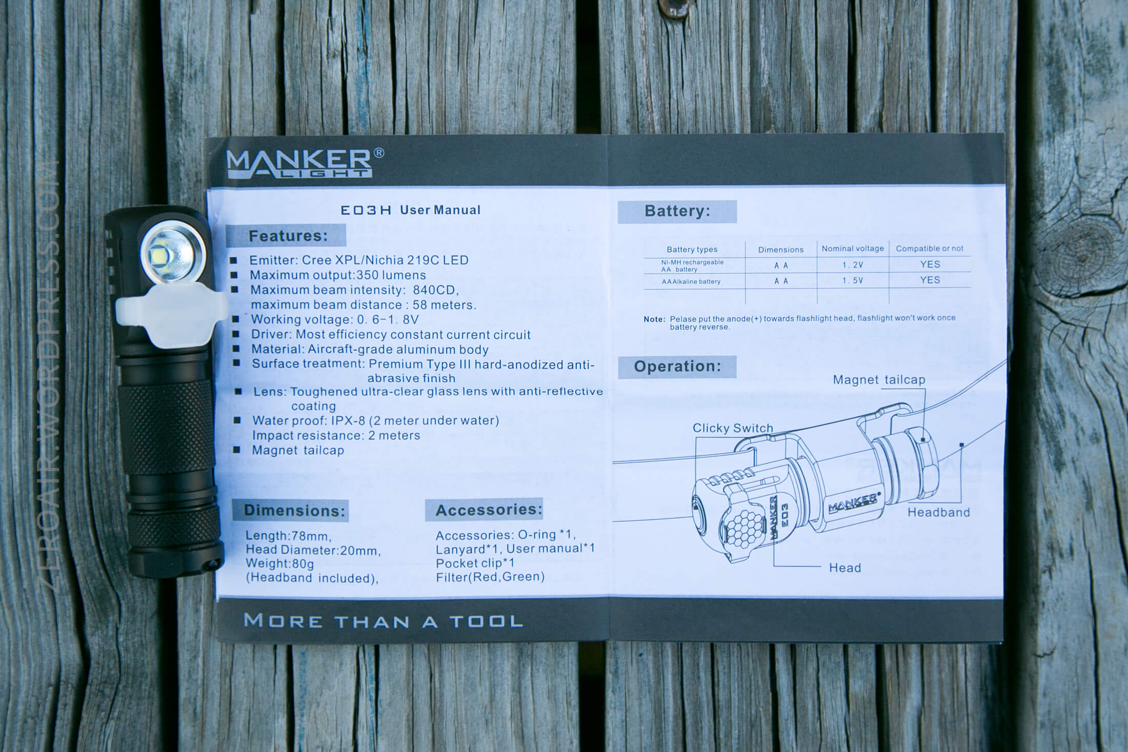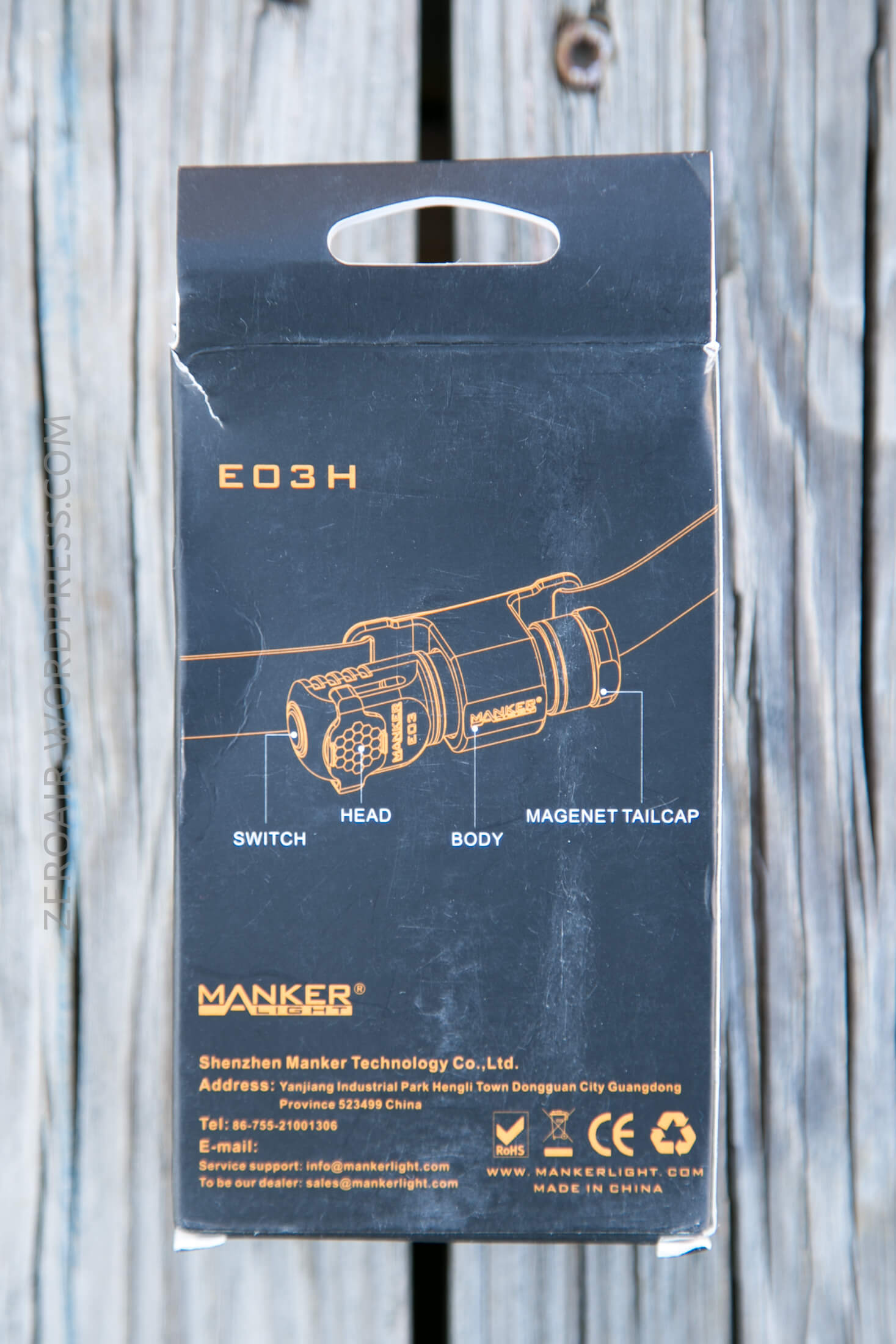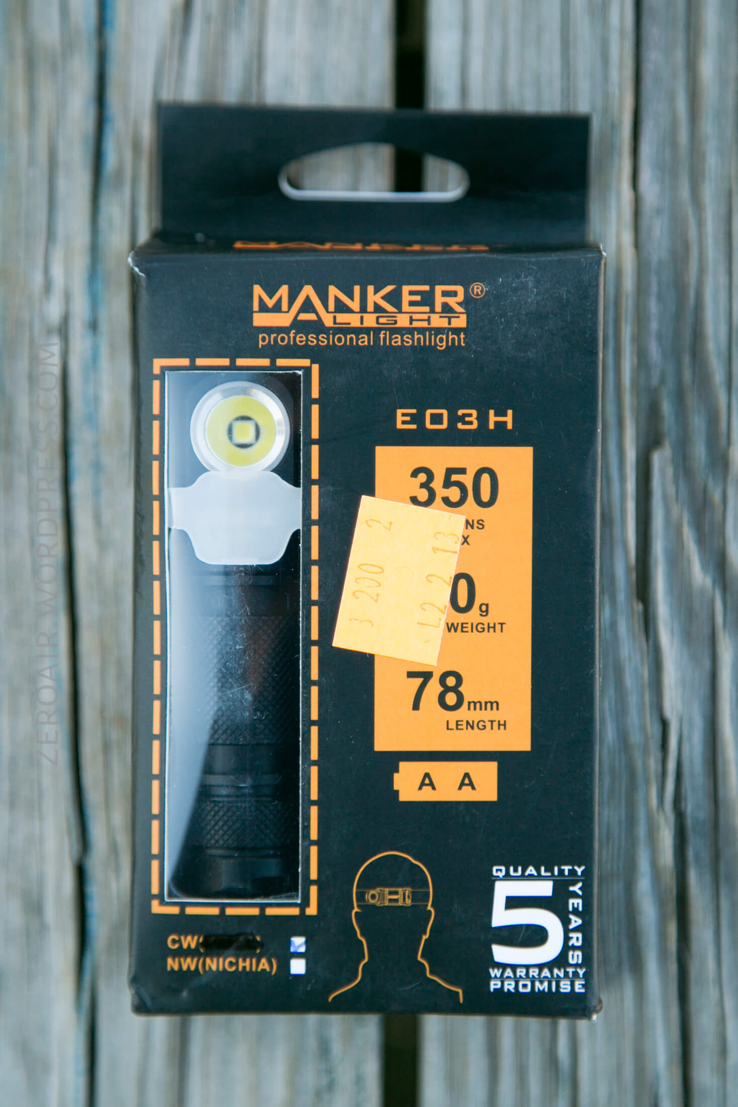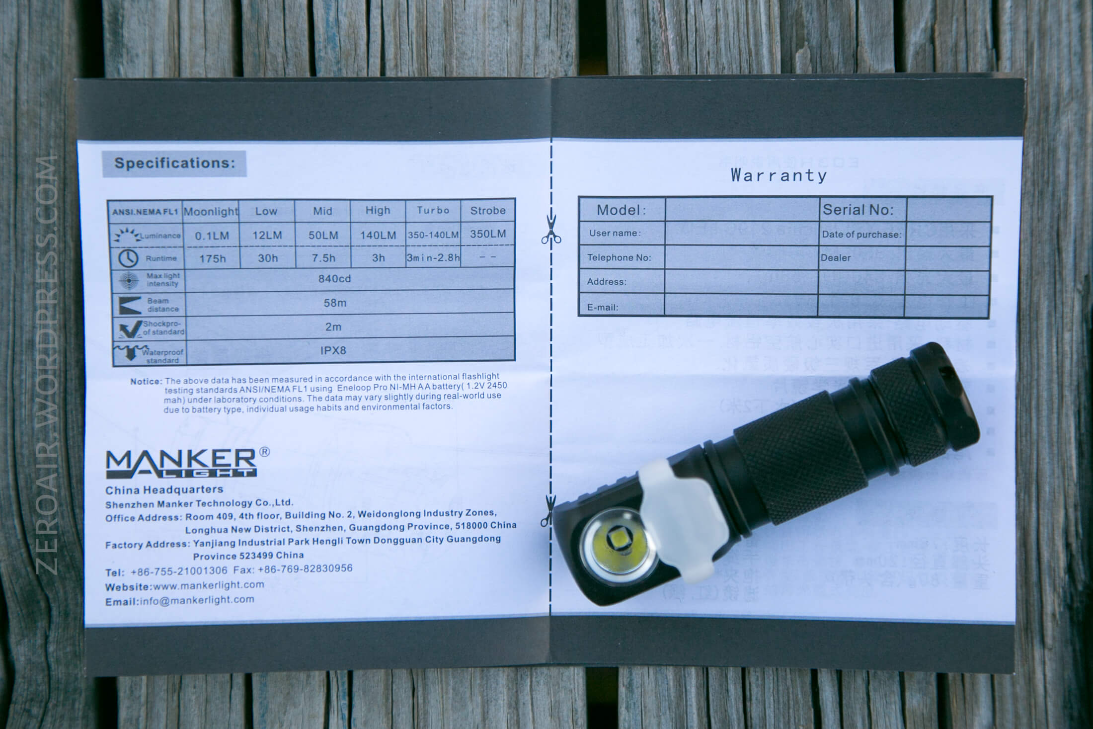 The package Manker uses here is a display-ready cardboard package with a window, which displays the light nicely. The package has very general specs, and an illustration of the light, but not more.