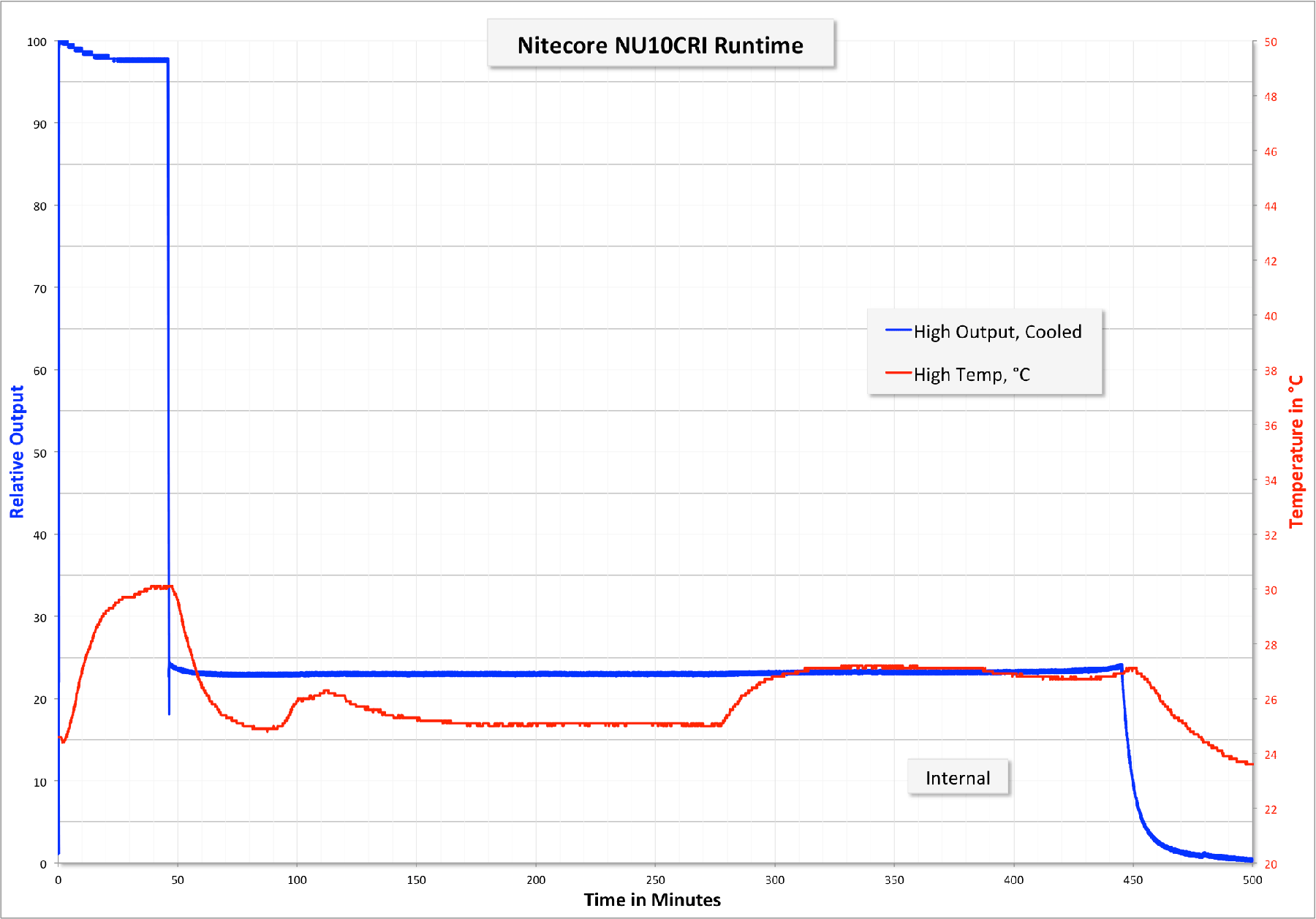 The NU10 is very interested in runtimes. There’s a timed stepdown on every mode at 45 minutes – the light steps down to the next available mode. That can be seen in the runtime above, where High steps down to Medium.