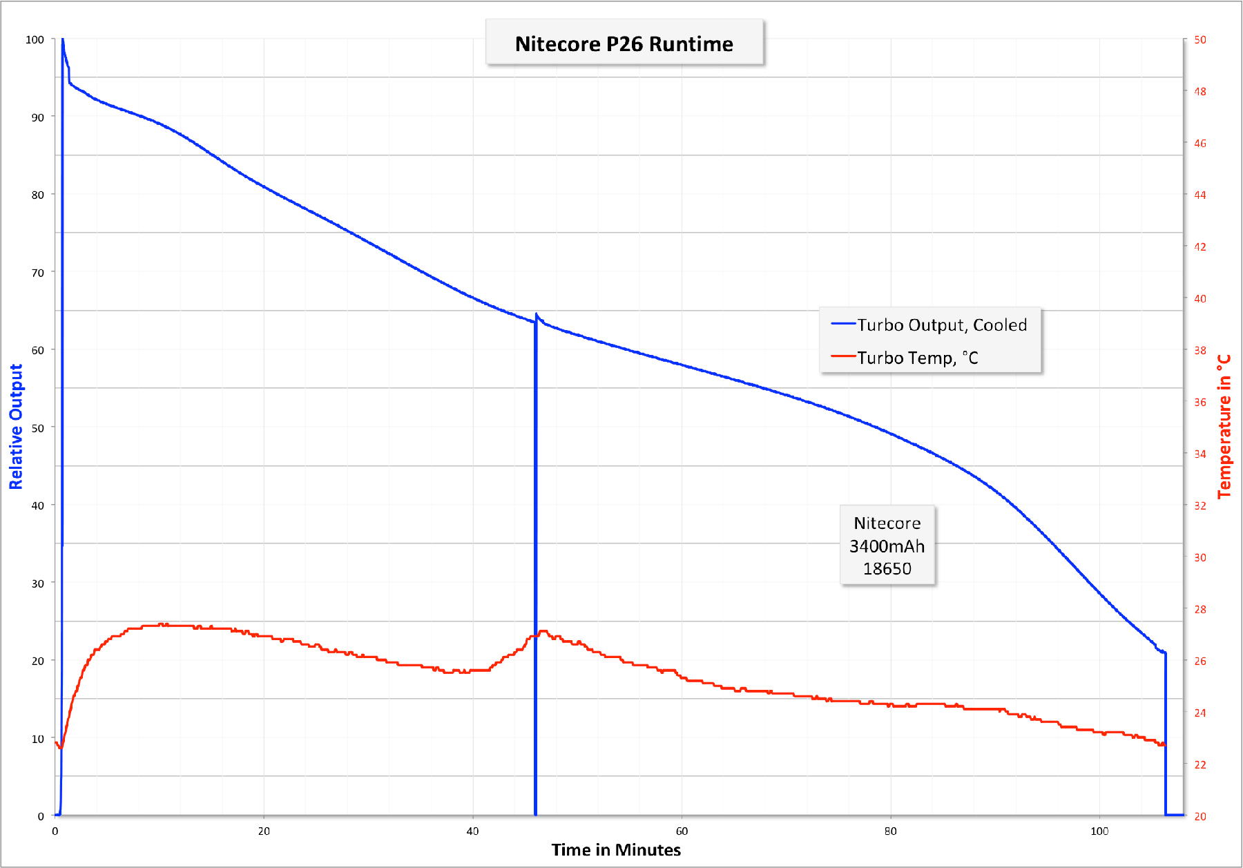 There seems to be no regulation on the output. “Turbo” (or “100% output) seems to hold out for a minute or so, but then steps down by a few percent, and begins a steady decline (which looks to track cell voltage). The light will not reach 100% output again (as seen around 47 minutes, when I rolled the dial down and back up to 100% – actual output doesn’t change.)