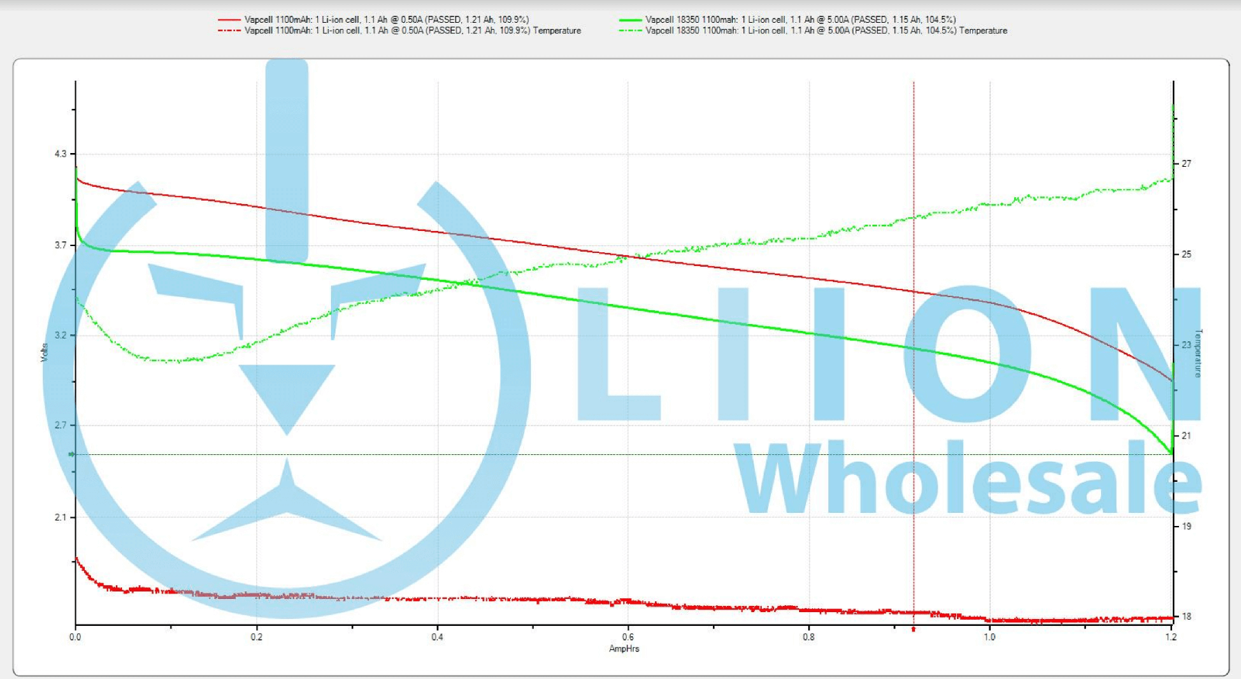 Notably on the chart above, at a drain of 0.5A, the cell shows a capacity of 1200mAh! Well above the rated capacity. The difference in what I tested and what’s seen here is likely due to me discharging at higher than 0.5A, and I stopped around 3V (instead of 2.5, as tested above).