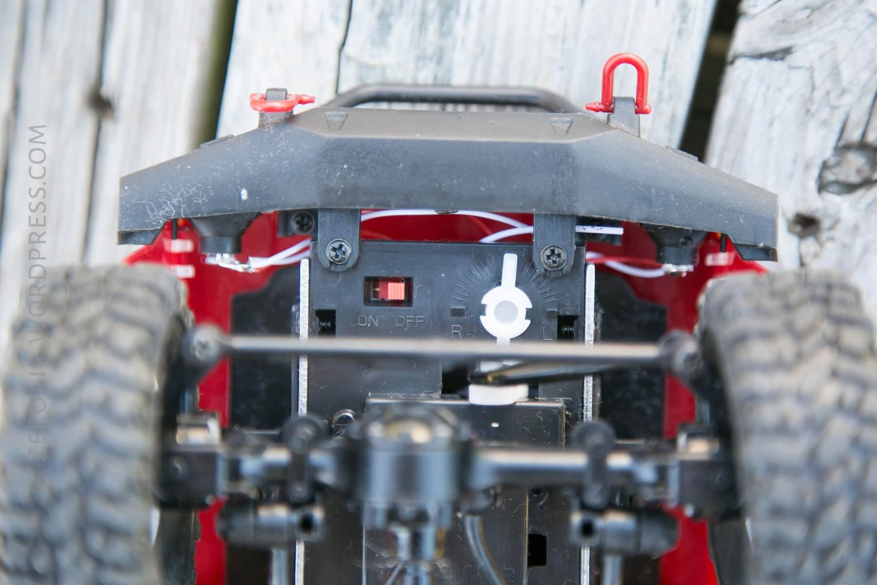 Included with the RTR package is a handheld receiver, a wheel for steering, and a trigger for forward/reverse. It’s an extremely simplistic unit, with just an on/off switch. The wheel travel for turning is also very short – probably 1/8 of a turn on the knob, and the wheels are at full lock. I found this to be annoying and felt like I was banging on the device the whole time I used it.