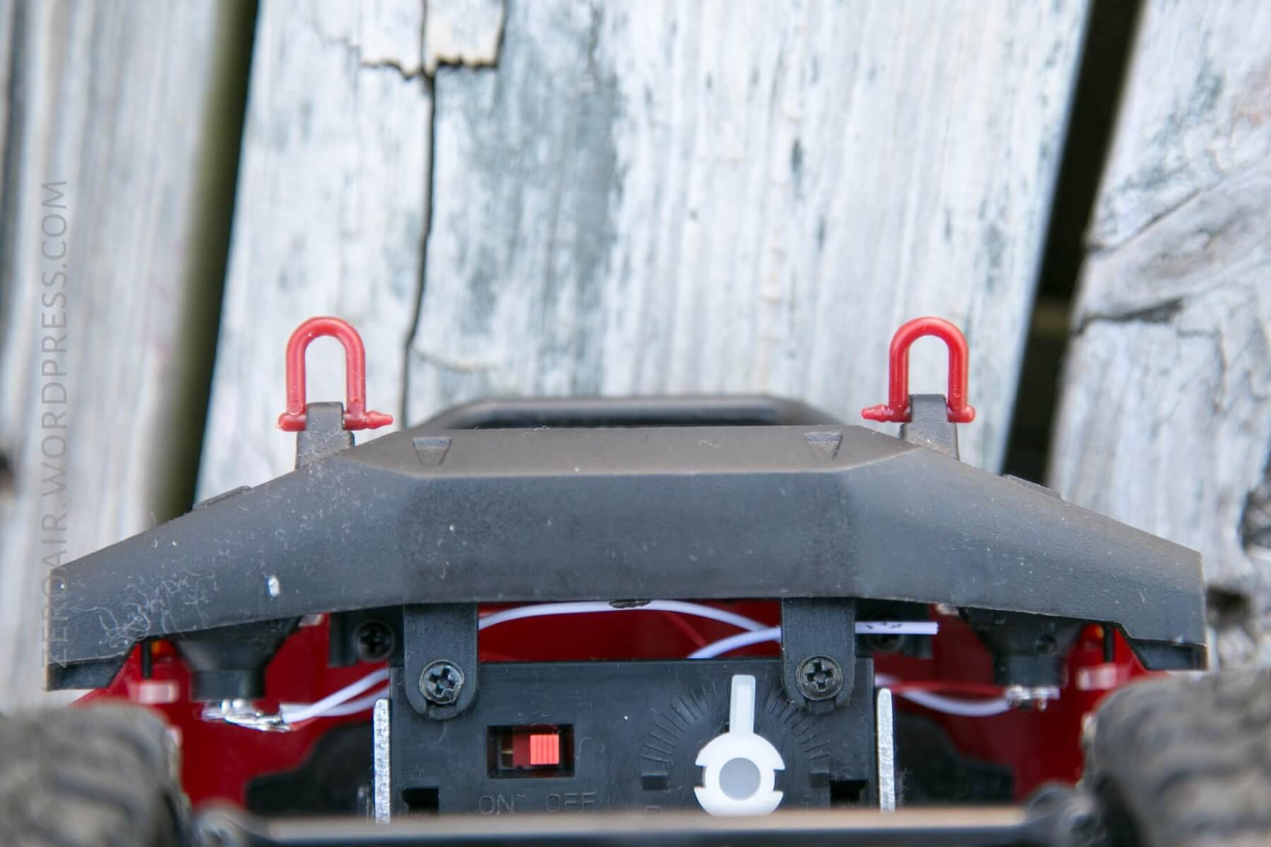 Two hooks go on the front. There are four tow hooks included. Two go on the front, and though I didn’t notice connectors on the rear, I expect two to go there. Or there are spares? There are spares of other parts, in any case.