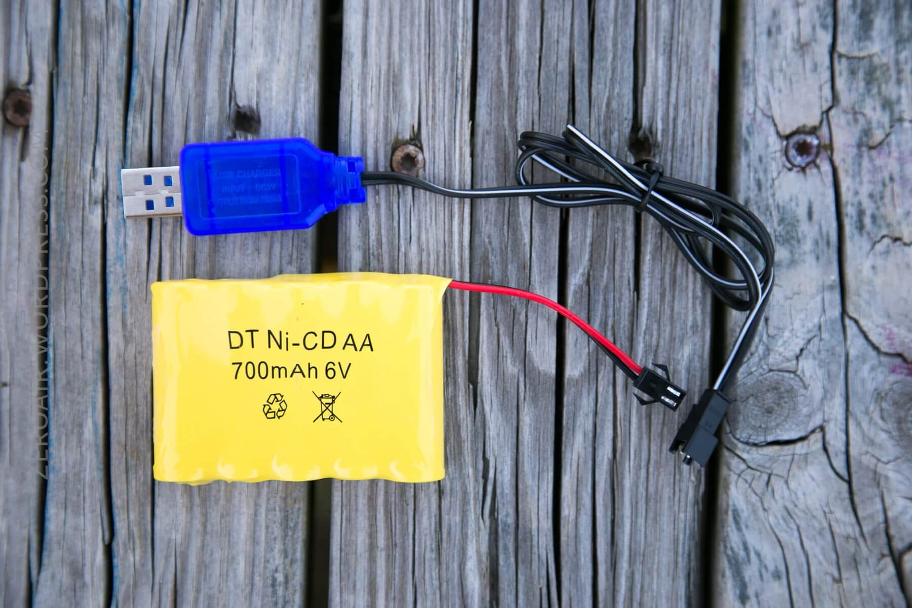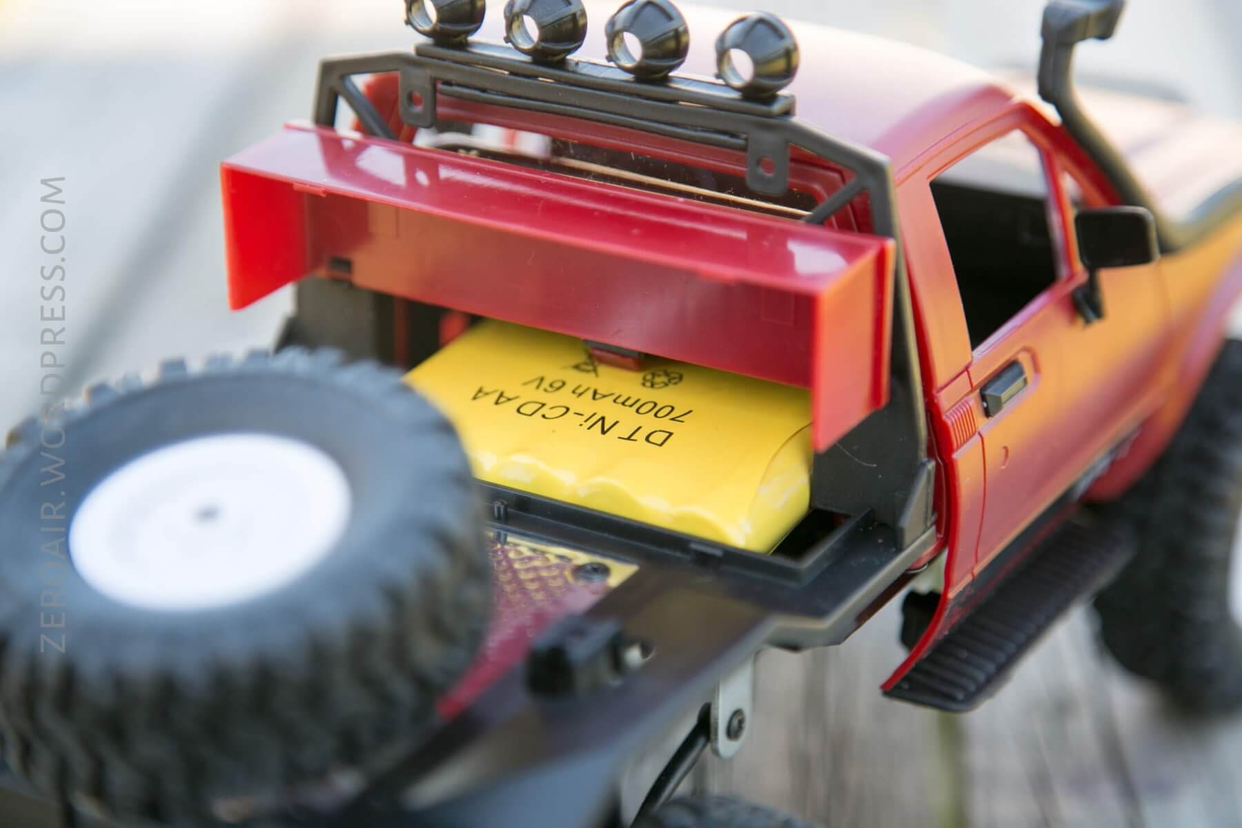 The truck is powered by a battery pack of 5 NiCD AA-sized cells, for a total voltage of around 6V. These charge via a provided USB connection.