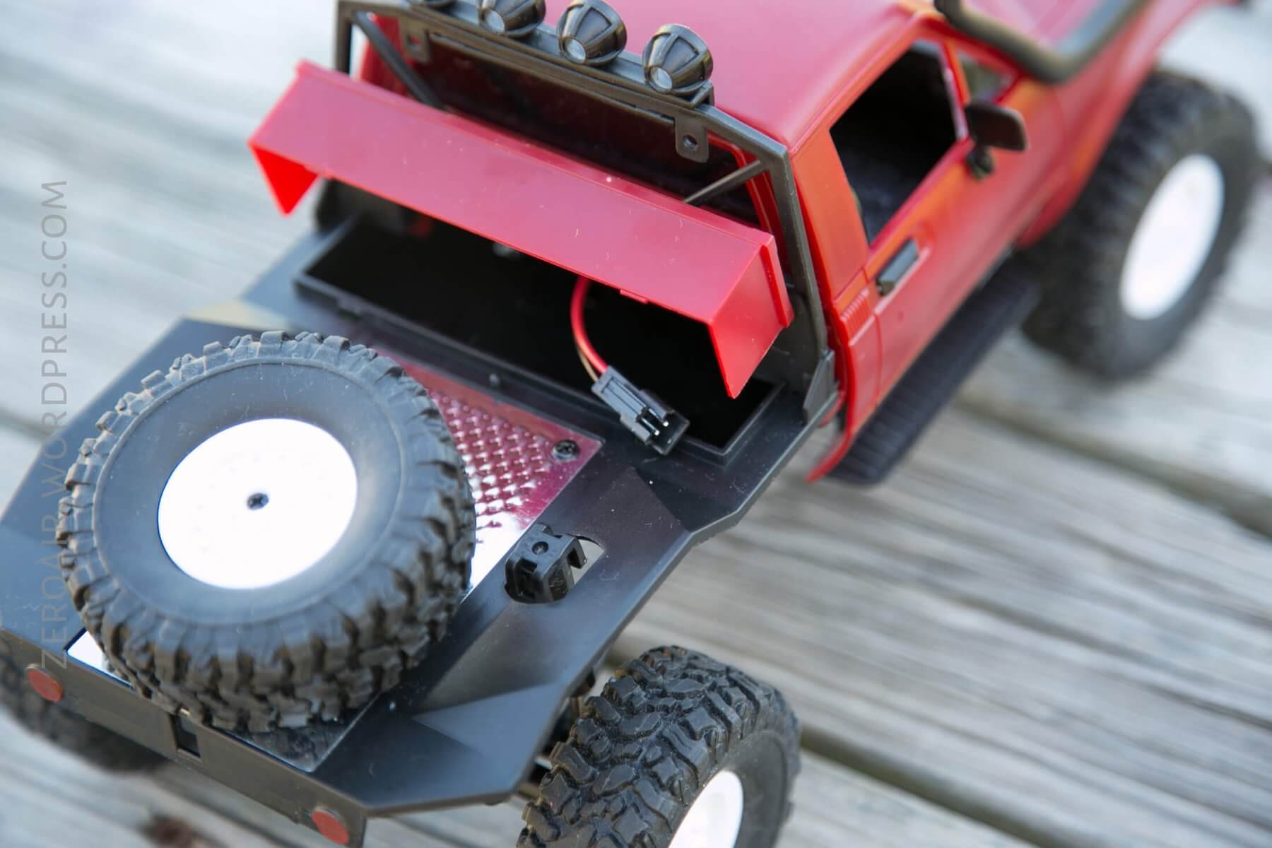 The battery lives in the “toolbox area” of the truck. This little door flips up easily, and the two-prong male end of the connector is loose inside. This door did seem to be sturdy, but it is not waterproof.